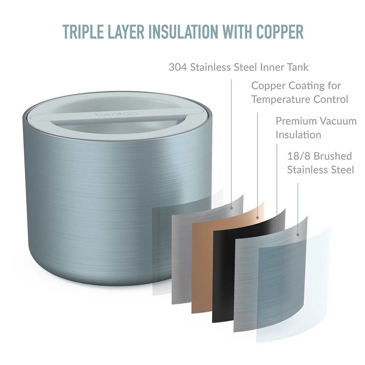 - Triple layer insulation; double-walled 18/8 stainless steel, copper coating, vacuum insulation.