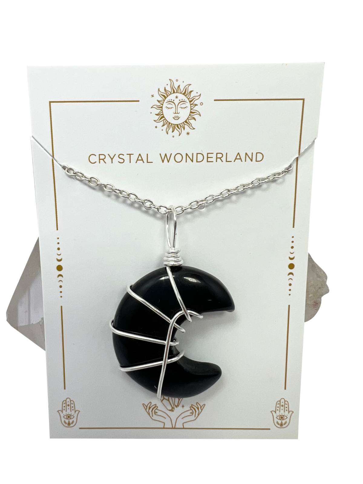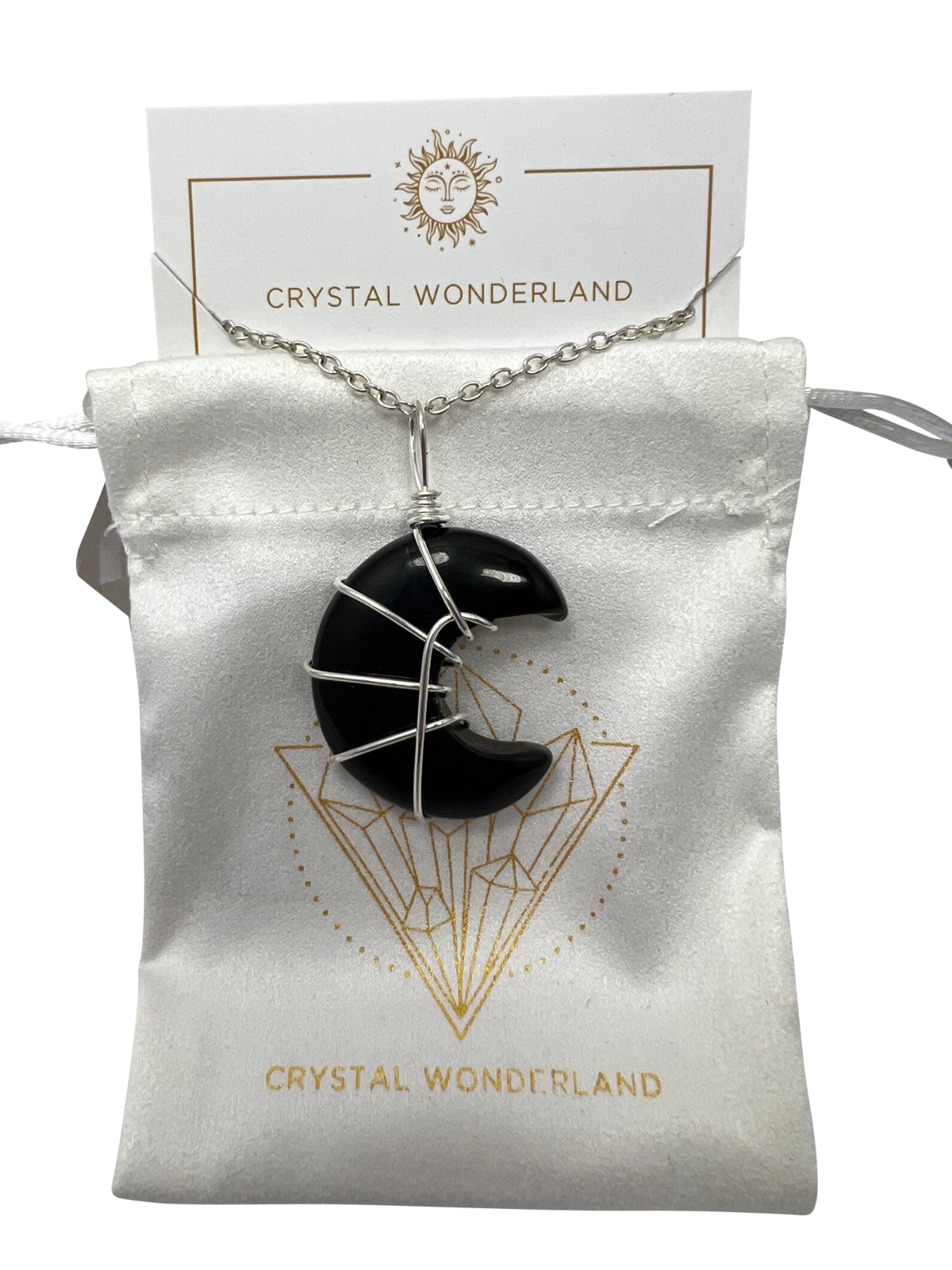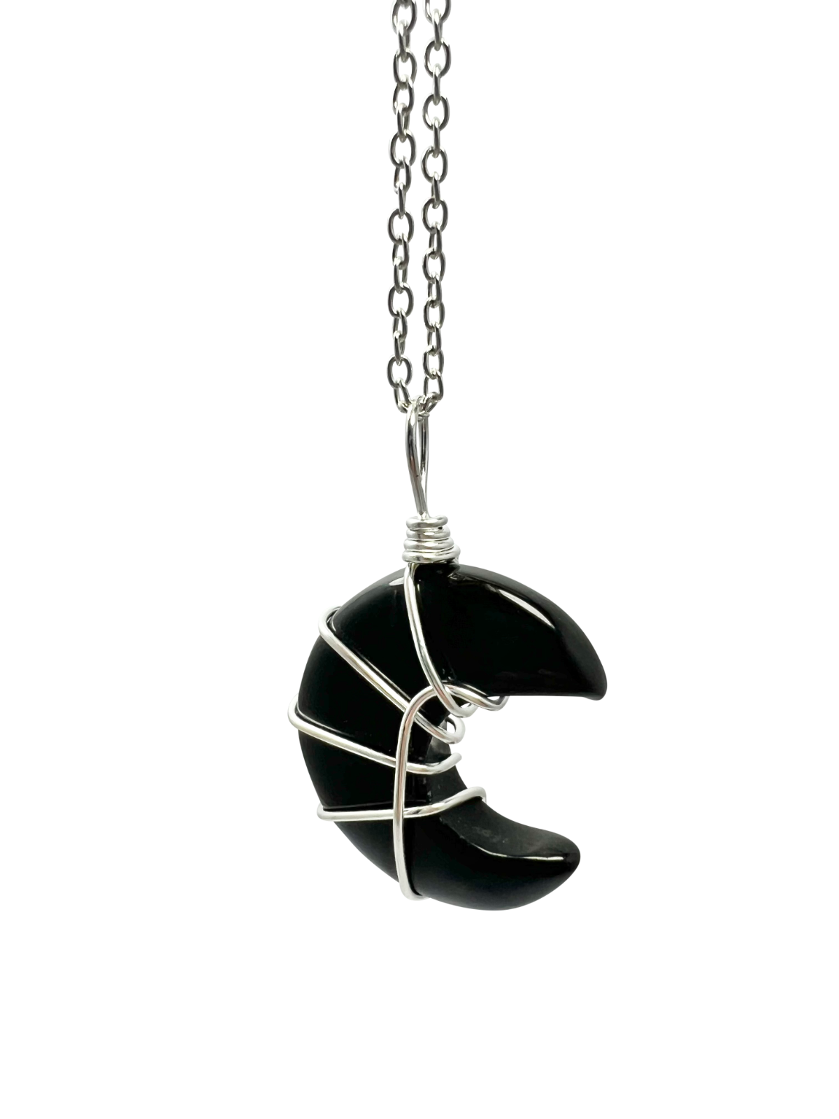 Black Obsidian Half Moon Shape Pendant Necklace Silver Healing Polished Tumbled