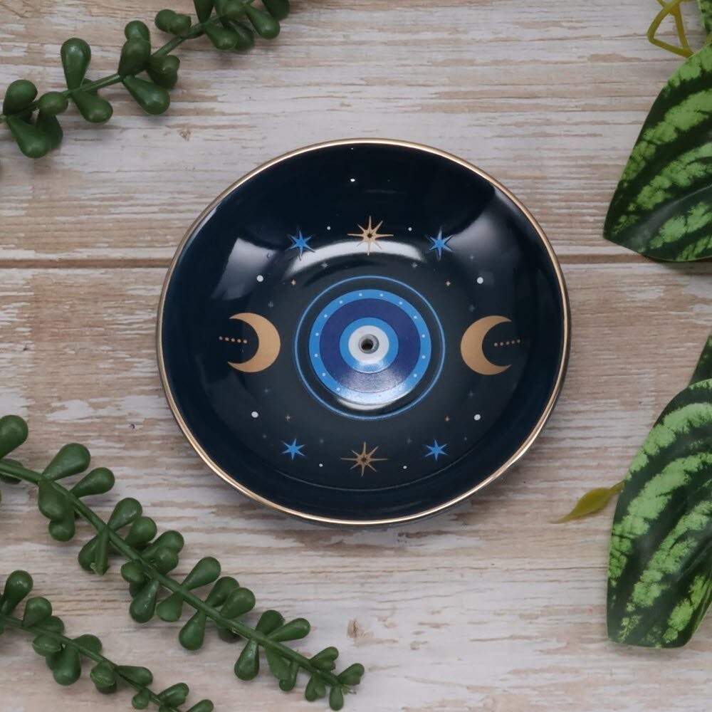 Enhance any space with a touch of mystery using this dark blue incense holder, adorned with an all-seeing eye print encircled by crescent moons and stars.