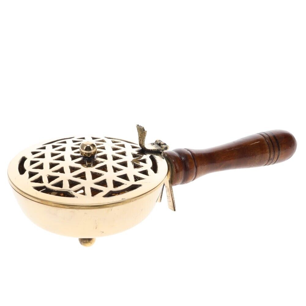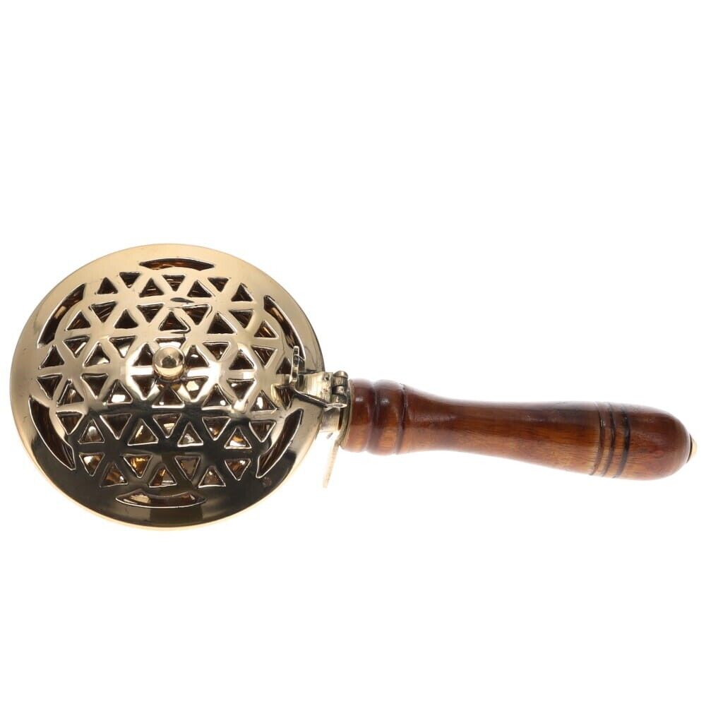 Brass Incense Burner Flower of Life Holder Wooden Handle - 10x22cm