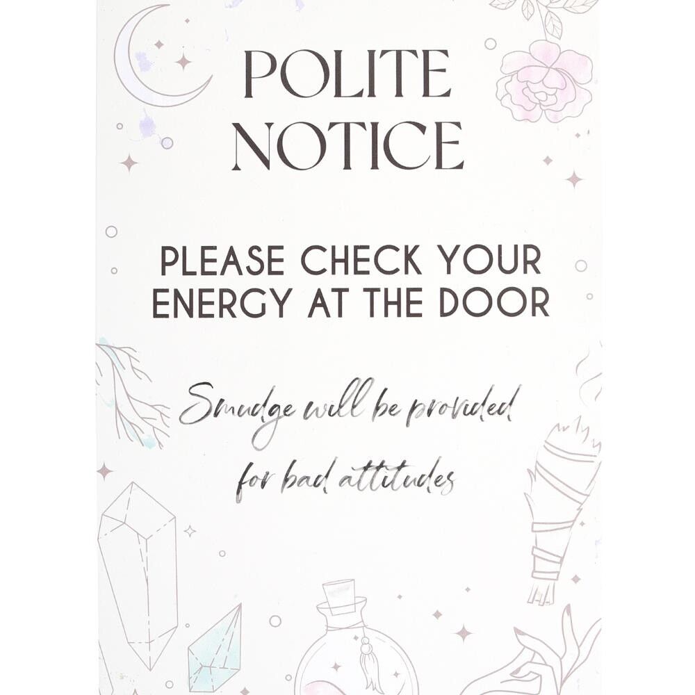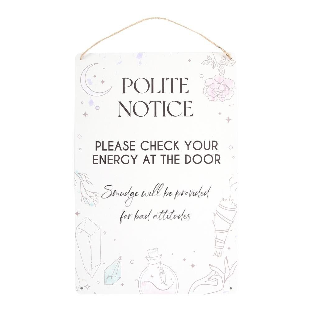 Add a dash of humor and a touch of charm to home and office surroundings with our metal Hanging Sign with a Rope Hanger, featuring illustrations of crystals, potion bottles and smudge sticks with the fun phrase, "Polite Notice, Please check your energy at the door. Smudge will be provided for bad attitudes".Part of the 'White Witch' collection.