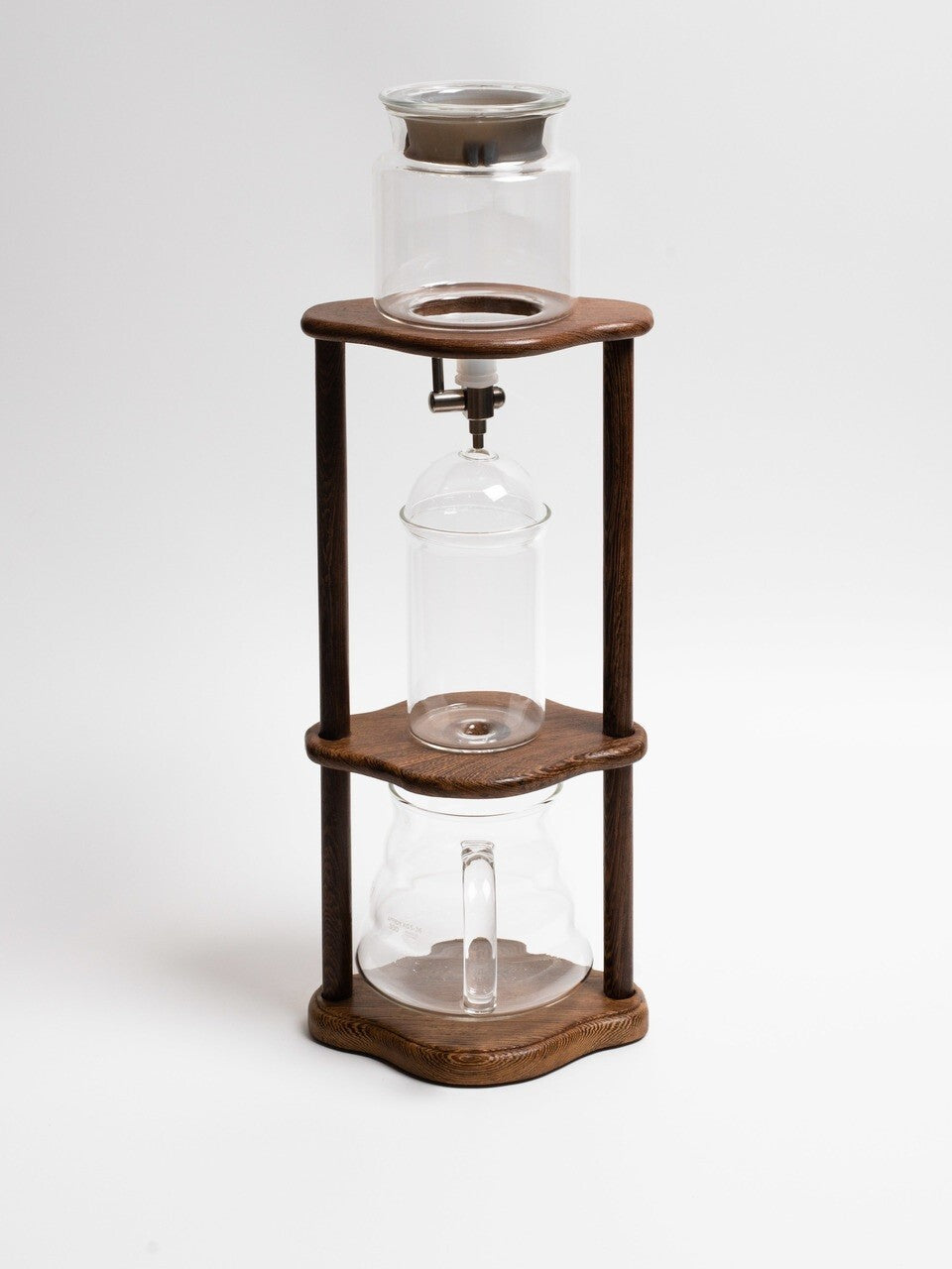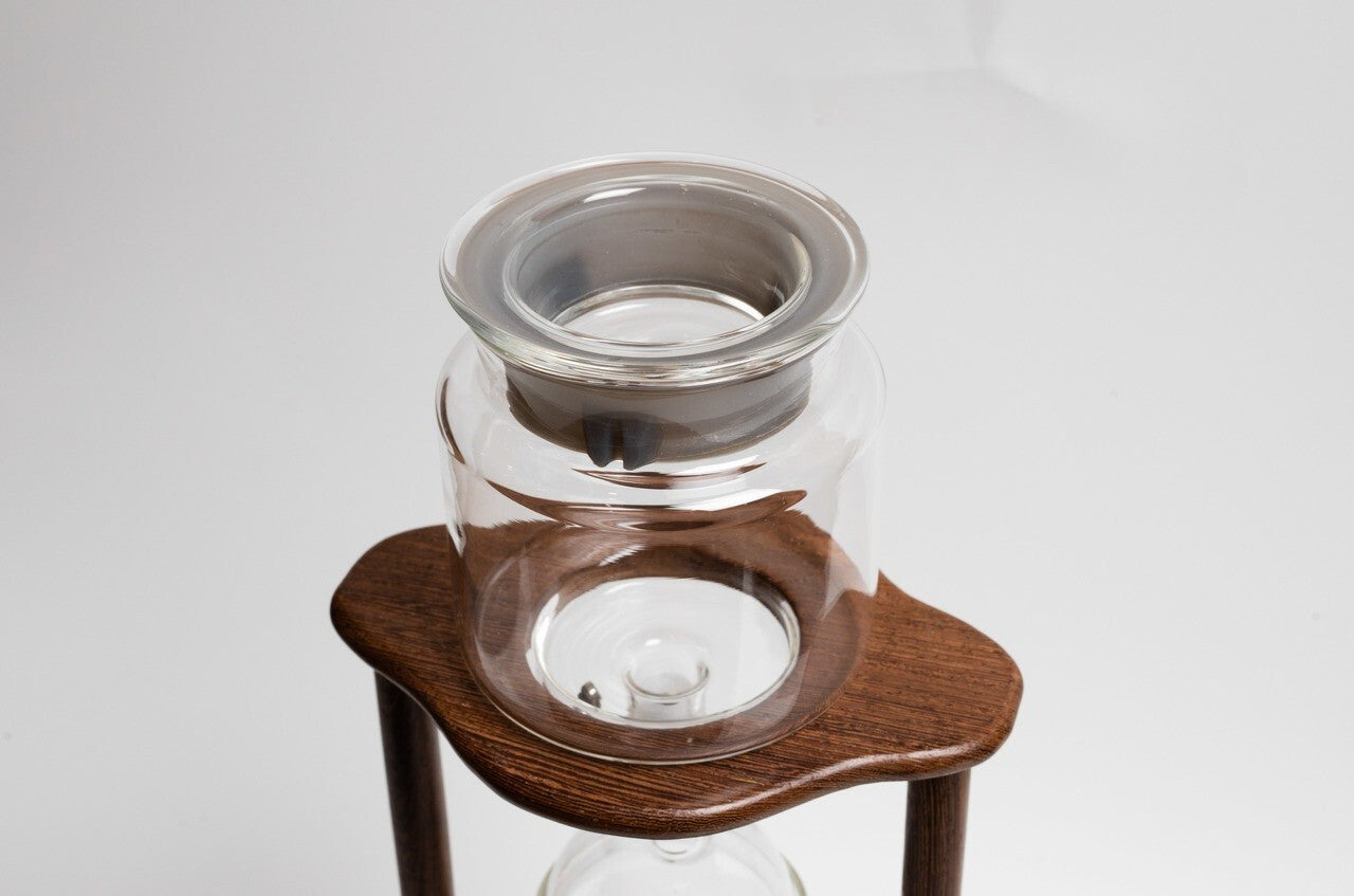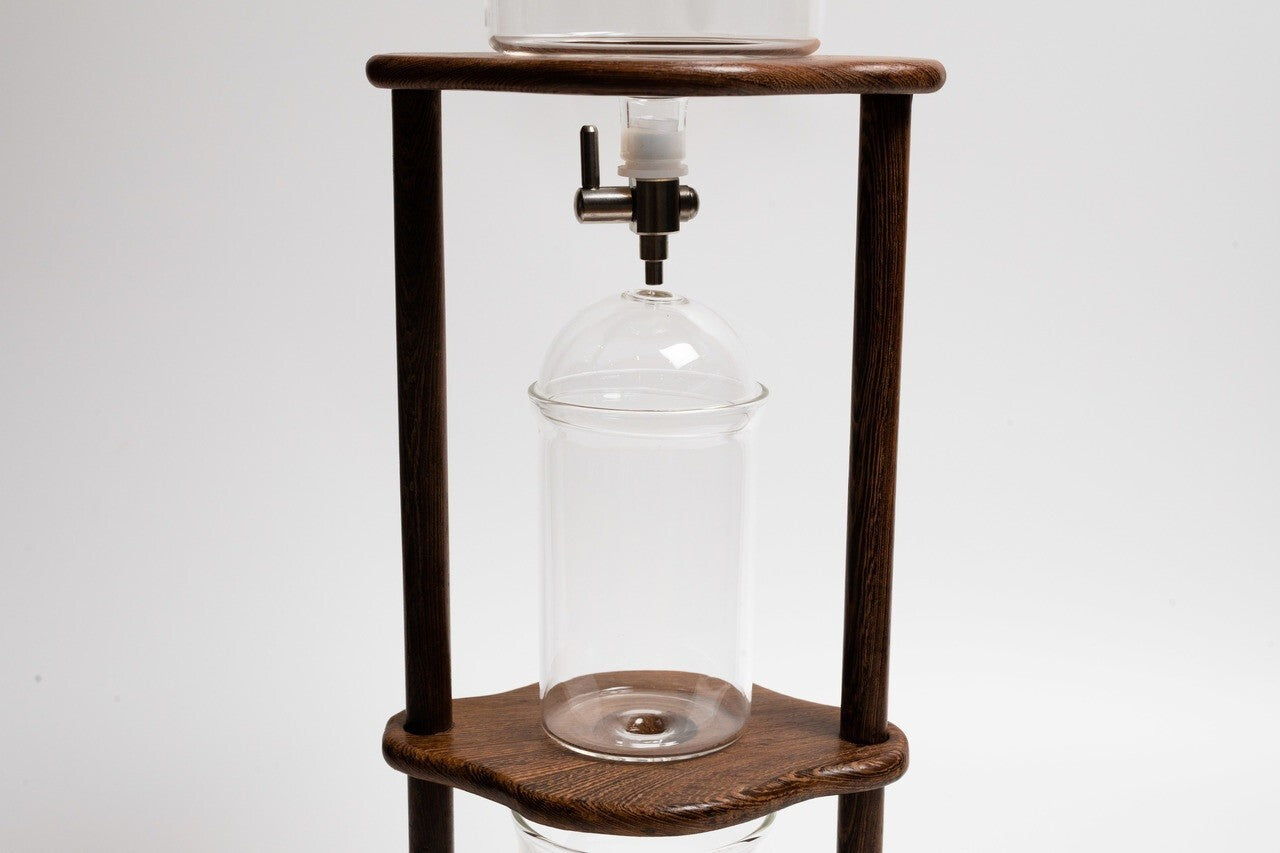 Cold drip coffee tower with a wooden stand.