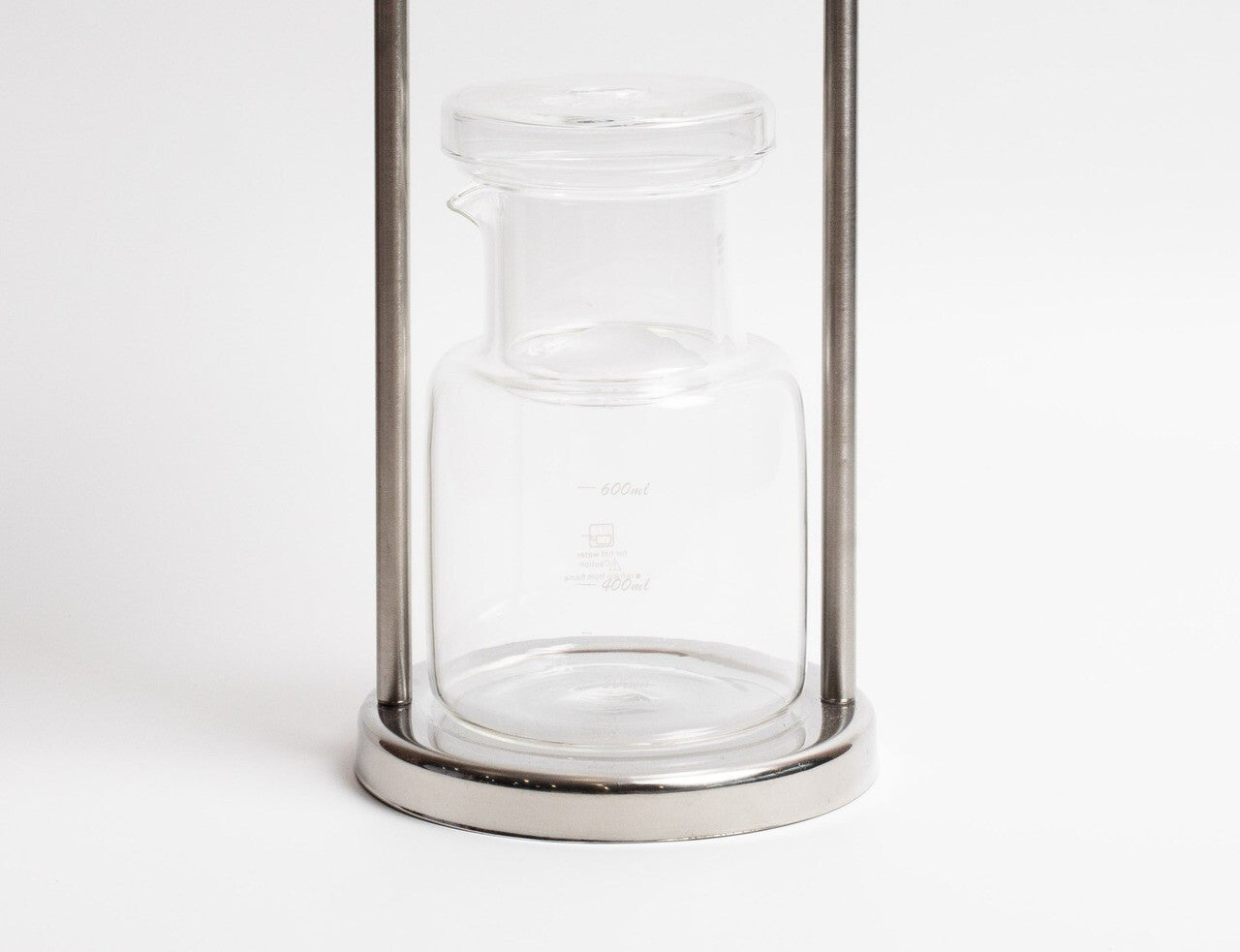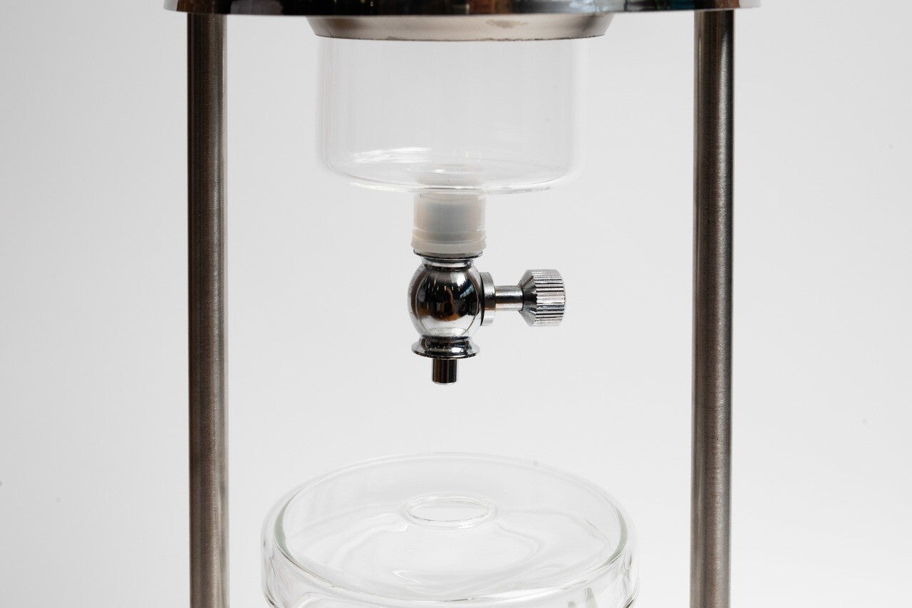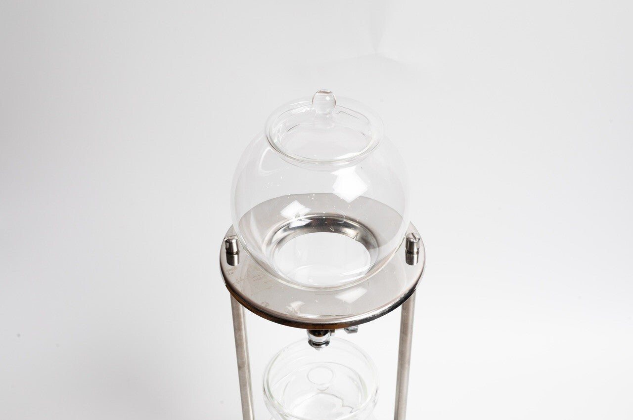 Cold drip coffee tower with a stainless steel stand.