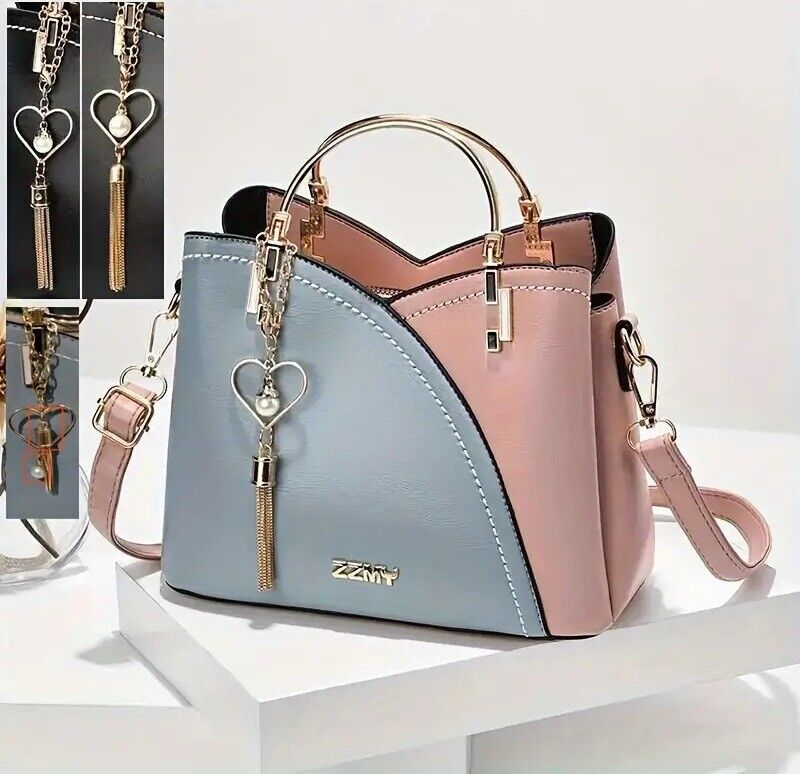 Color Block Satchel Bag Trendy Metal Tassel Decor Crossbody Bag Light Blue Rose