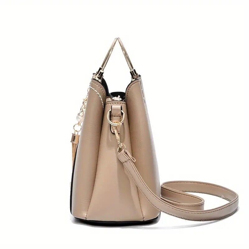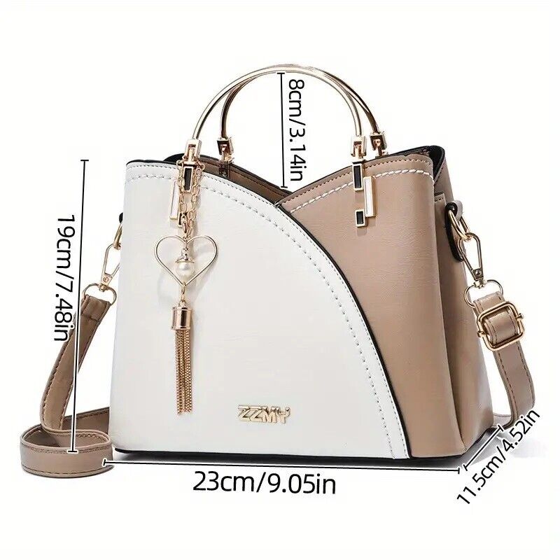 Color Block Satchel Bag Trendy Metal Tassel Decor Crossbody Bag White Caramel