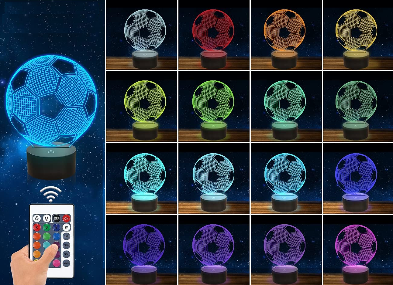 - MULTI-COLOR: Our soccer 3D desk light has 16 colors changing and 4 kinds of flashing and brightness options, the light can be dimmed and not too bright / Smart Touch & Remote Control is easy to use and your baby can change the colors from his bed.