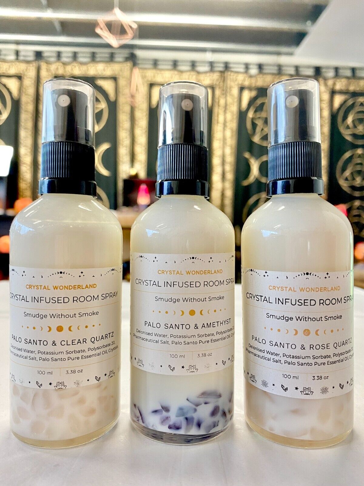 Ingredients: Deionised Water, Potassium Sorbate, Polysorbate 20, Pharmaceutical Salt, Palo Santo Pure Essential Oil, Crystals.