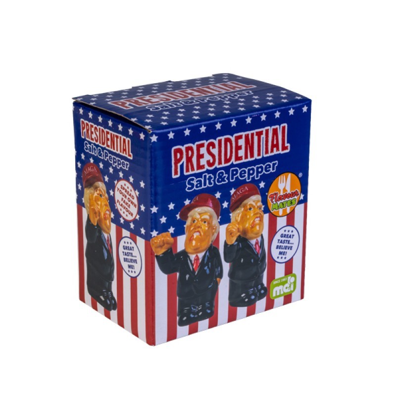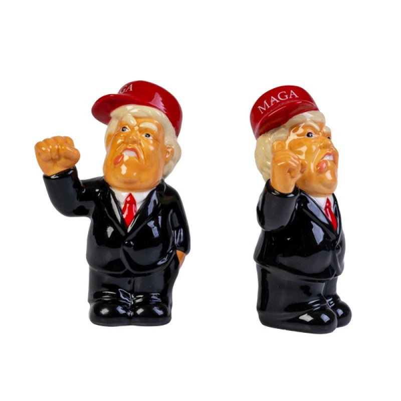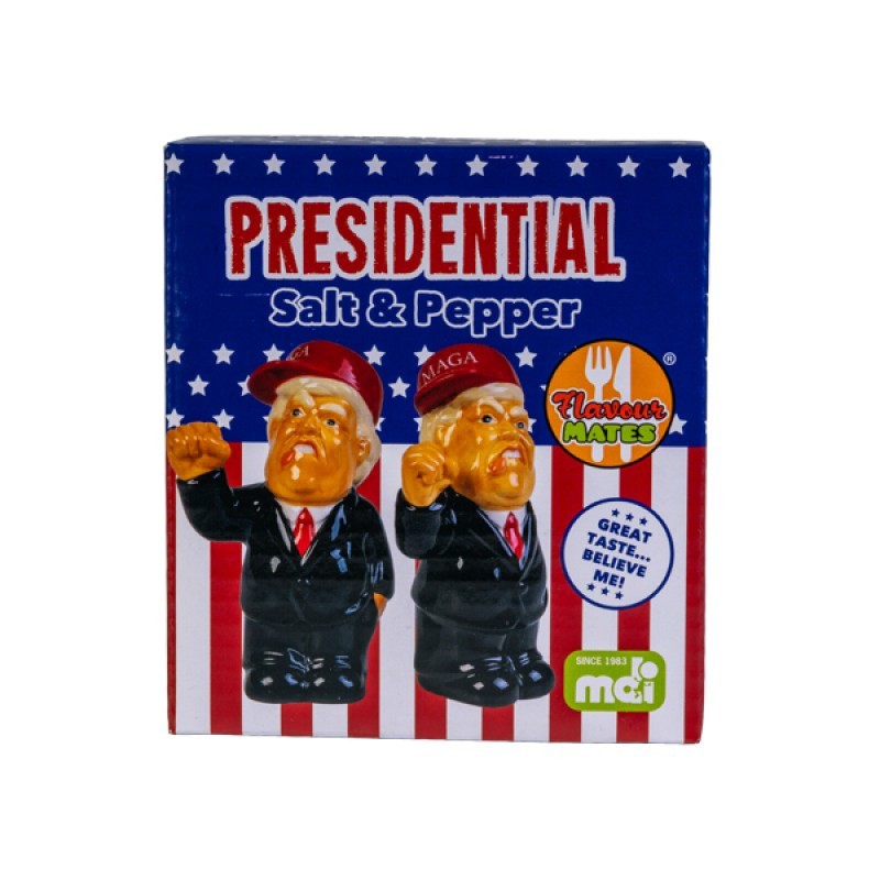 The Presidential Salt and Pepper Shakers are a fun and unique addition to any table setting. Shaped like a notable figure, these ceramic shakers add a touch of humor and personality to your meal times. Perfect for gifting or personal use, they are sure to be a conversation starter.