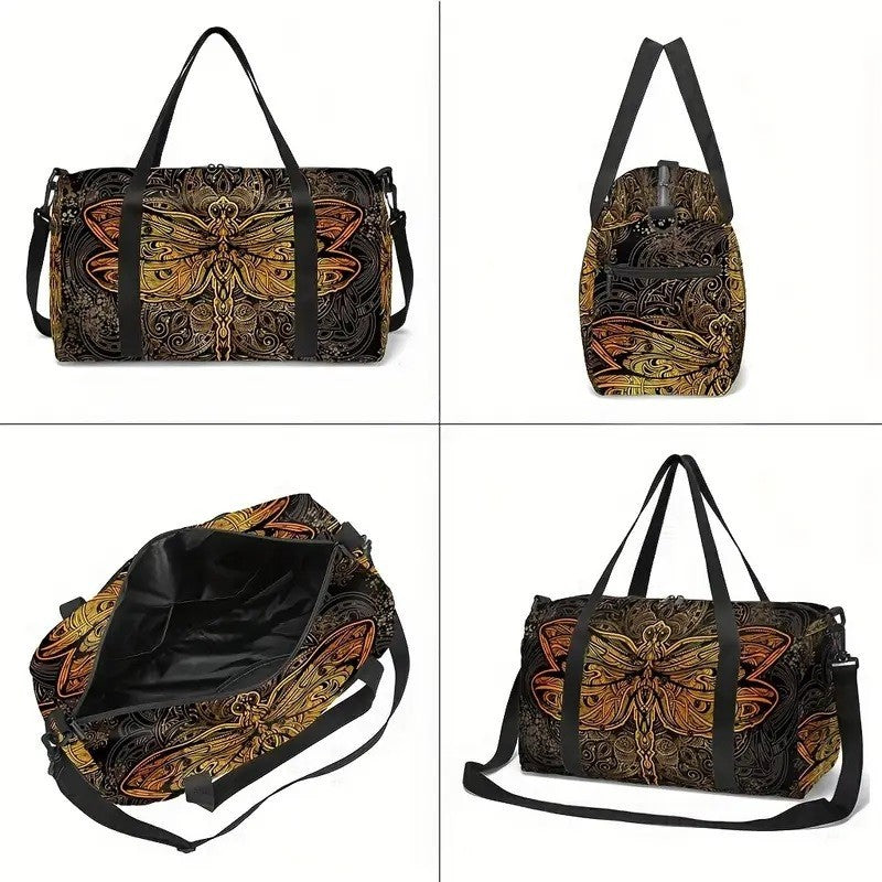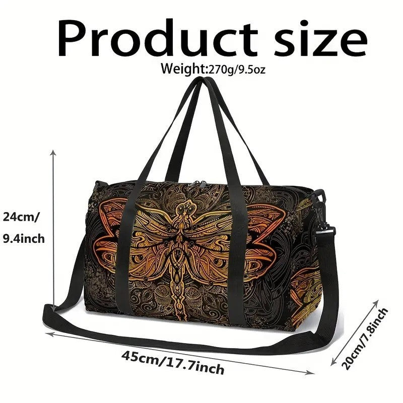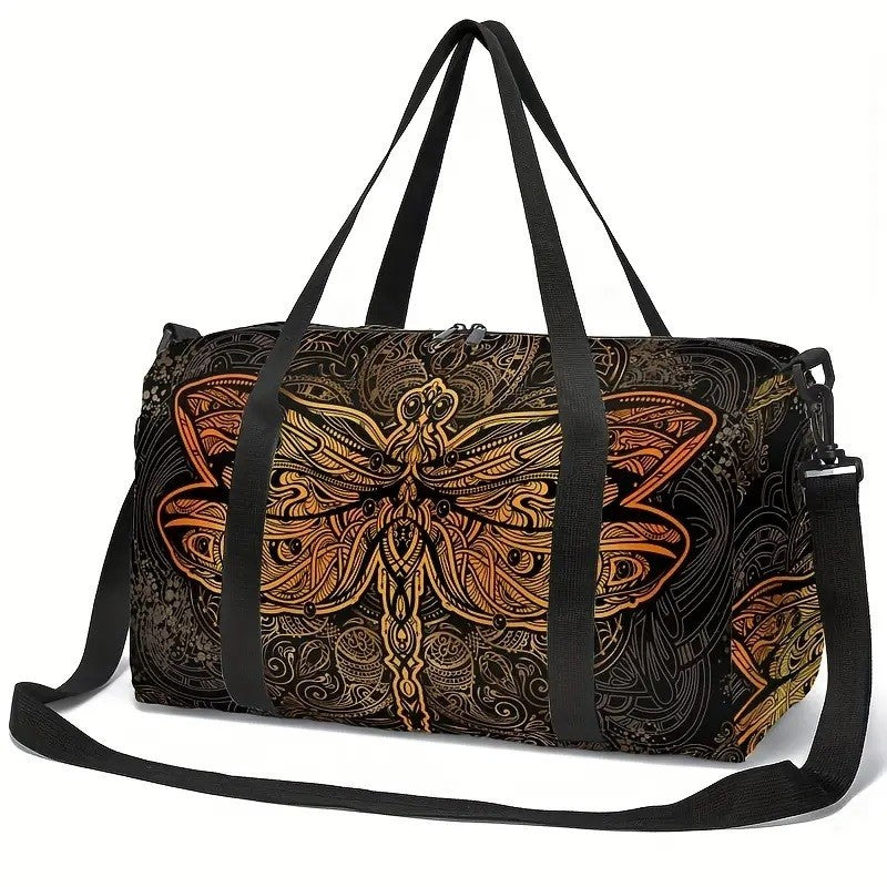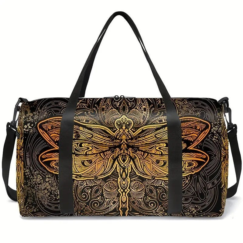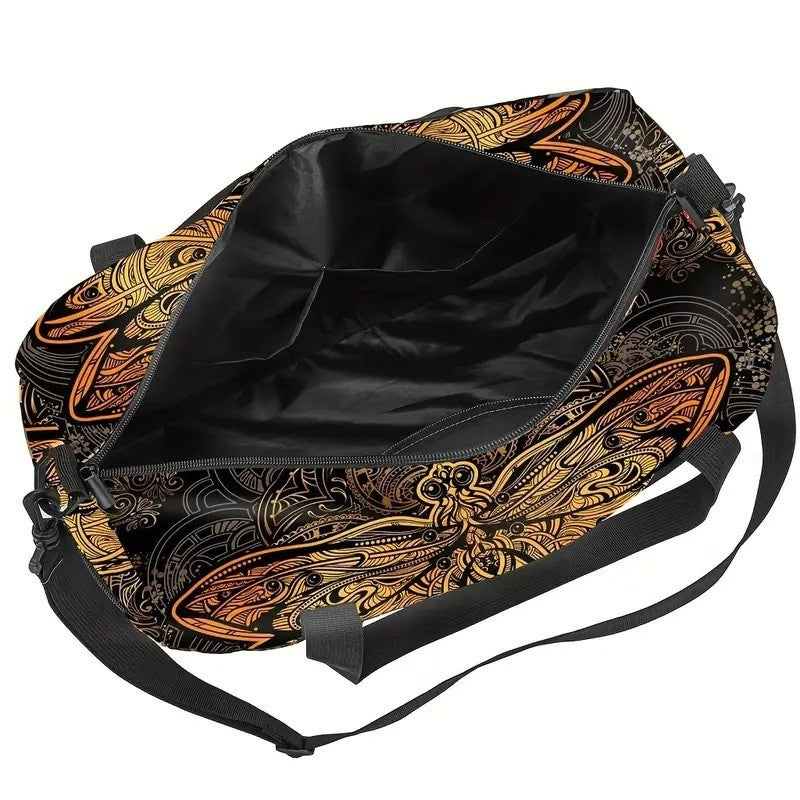 Travel in style with this dragonfly motif duffel bag, featuring a sleek black and golden design. Made from durable polyester, this versatile bag is perfect for the gym, yoga sessions, overnight stays, or weekend getaways. Lightweight yet spacious, it offers both fashion and functionality for everyday use.