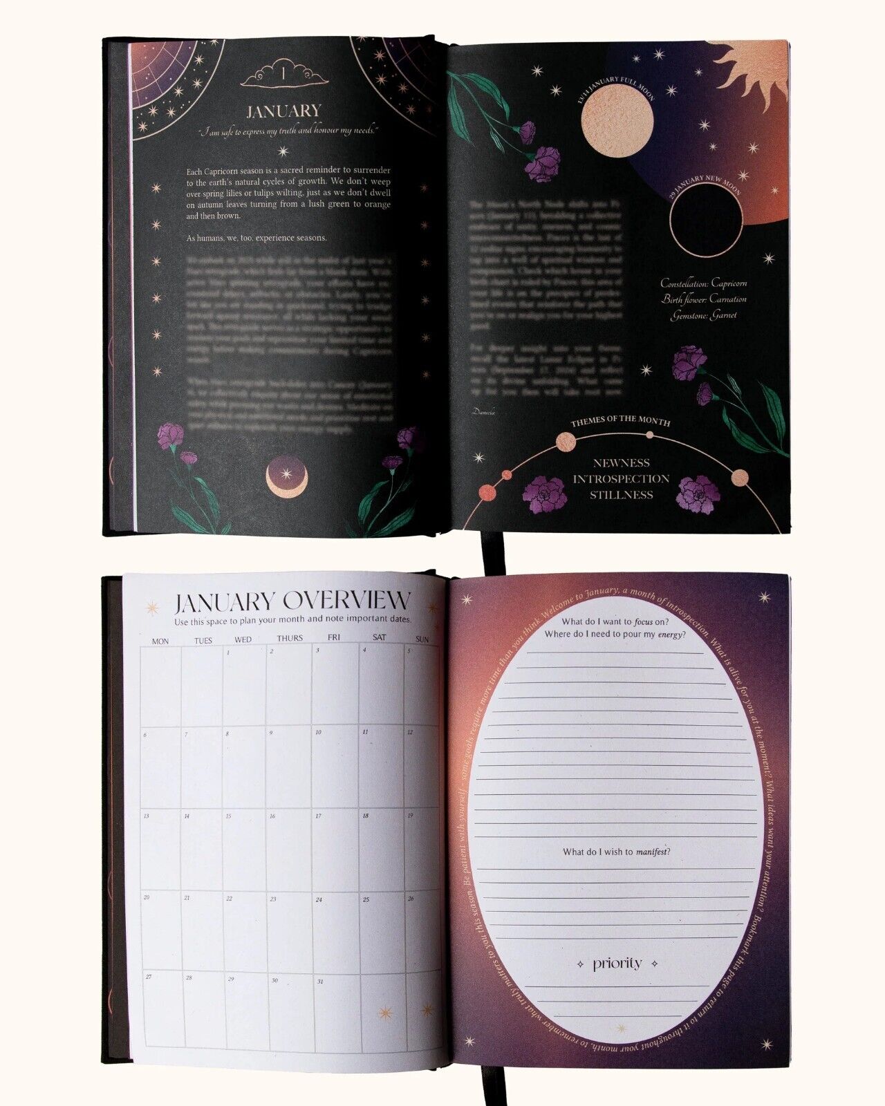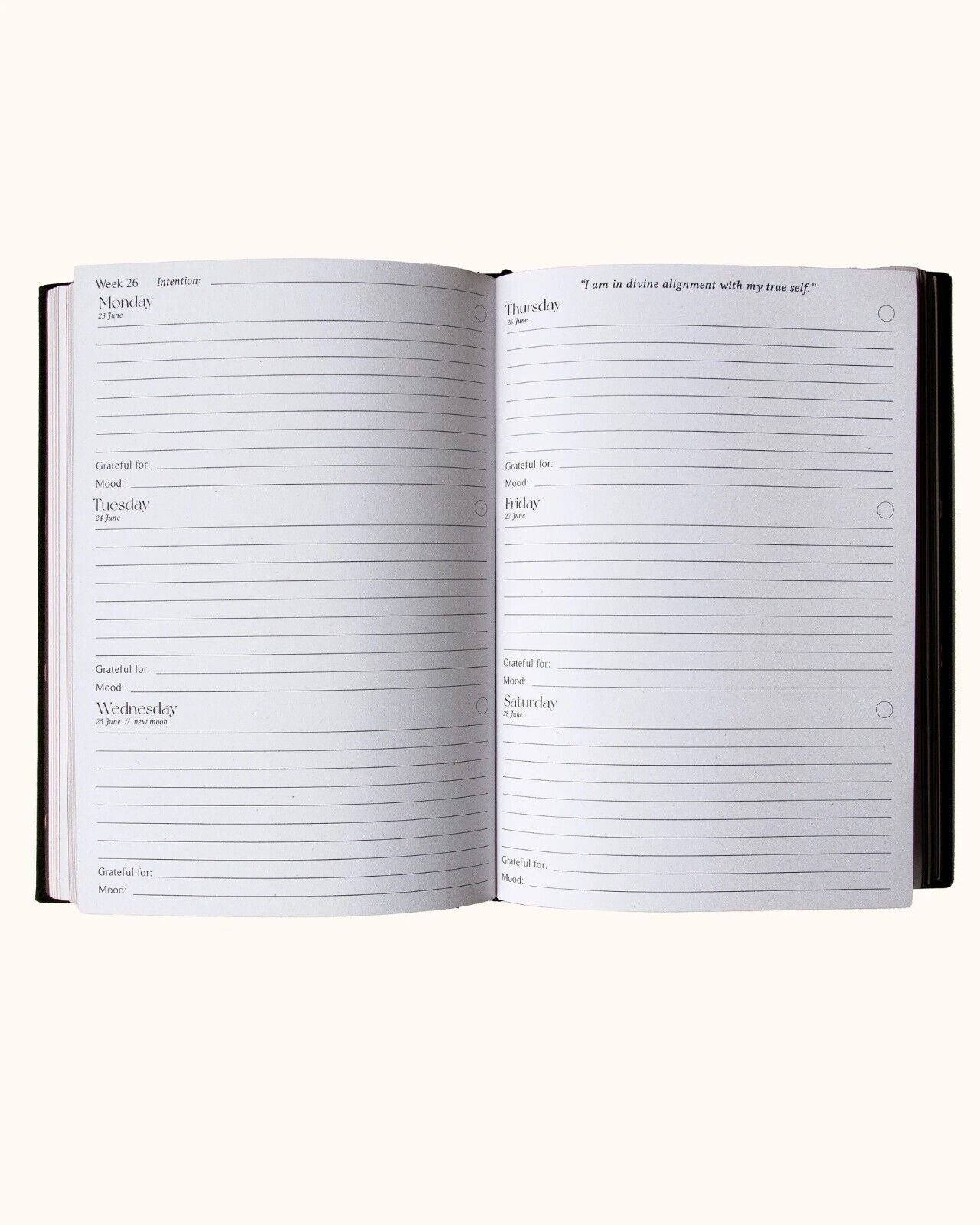 What's new This year, we combined minimalism with a magical vintage astrology book vibe, infusing the diary with more colour than usual. This edition is updated with moon ritual suggestions every new and full moon, daily mood tracking space, and a daily blank circle tracker for habits, moon cycle, or anything else you wish to record.