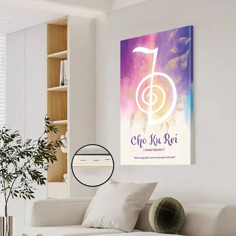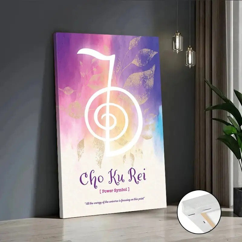 Elevate your space with this striking Framed Canvas Wall Art, featuring the powerful and inspirational "Cho Ku Rei" symbol – a renowned emblem of energy and intention. This modern abstract piece showcases a dynamic watercolor design in vivid shades of purple, pink, yellow, and white, blending spiritual meaning with artistic flair.