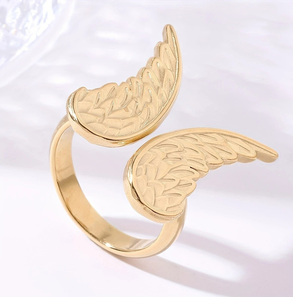 Crafted from stainless steel, the ring features a delicately detailed wing design, representing freedom, protection, and divine guidance. Its adjustable open band ensures a comfortable fit for most finger sizes, while the golden colour adds a touch of timeless luxury.