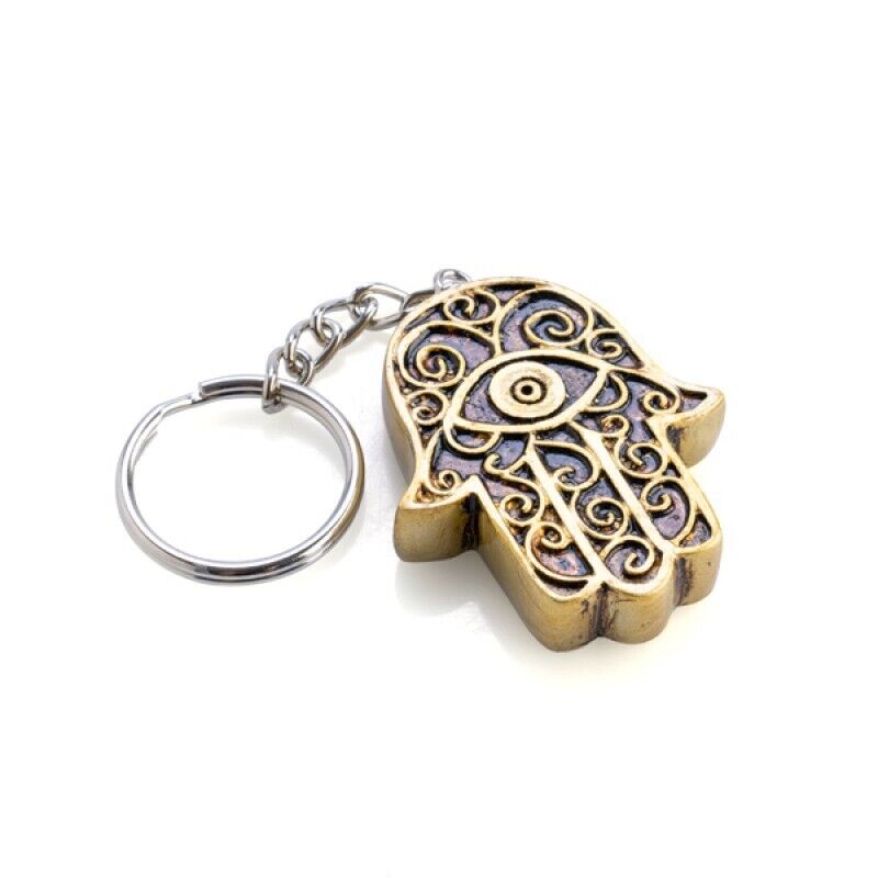 - Features intricate hamsa design with a metallic finish on a traditional keychain ring