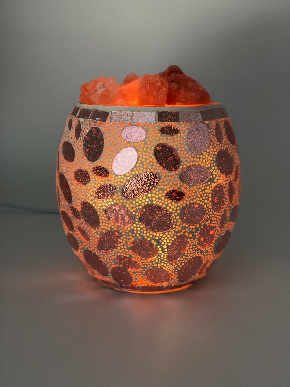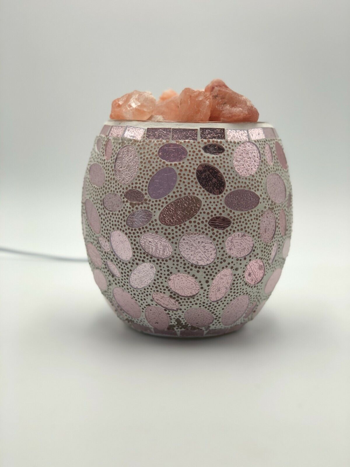 Our mosaic vase lamp, filled with natural Himalayan salt rocks, has a beautiful design on the glass vase which is mesmerising to look at and can have many health benefits.