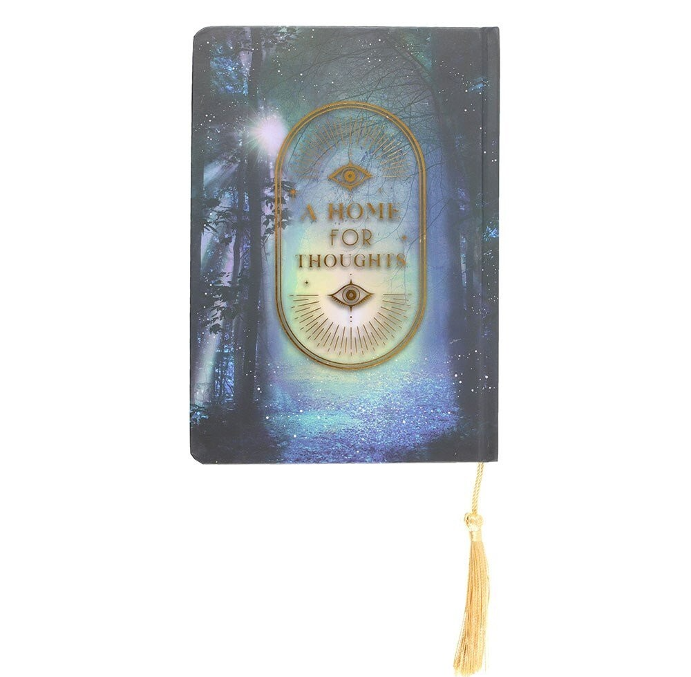 Featuring a captivating enchanted woods scene on the cover, it features the words "Home for Thoughts" alongside a gold eye design.