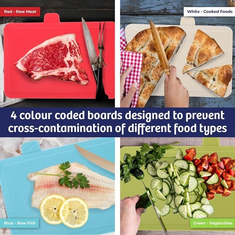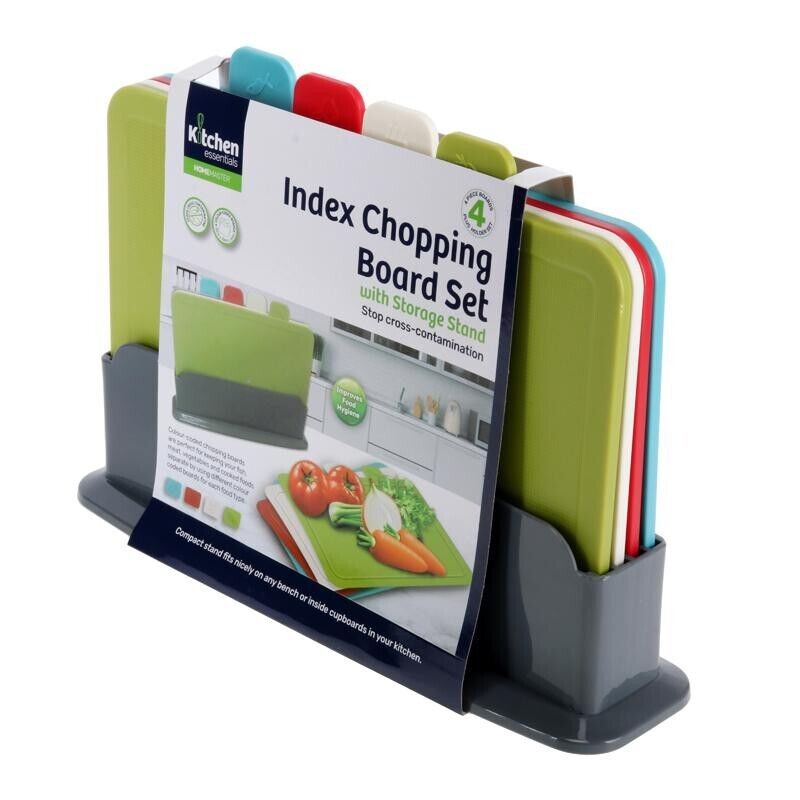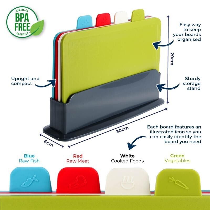 A compact colour-coded chopping board set, designed to avoid cross-contamination. Each board features illustrated tabs for identification and includes a sturdy storage stand.