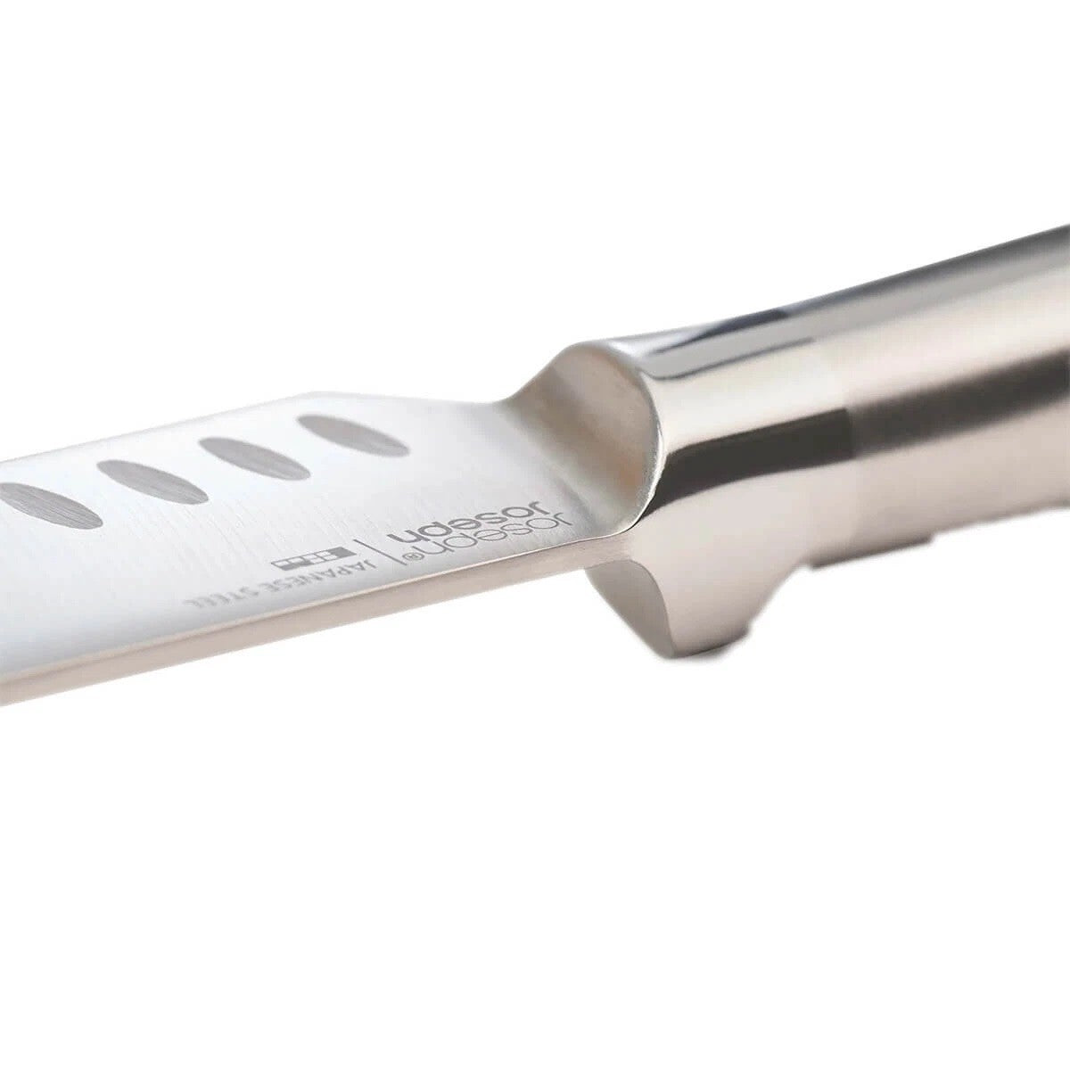 The Joseph Joseph Elevate 5 Piece Knife Set with Bamboo Storage Tray includes a 9cm Paring knife, 11cm Serrated knife, 14cm Santoku knife, 20cm Chef’s knife, and a 20cm Bread knife.
