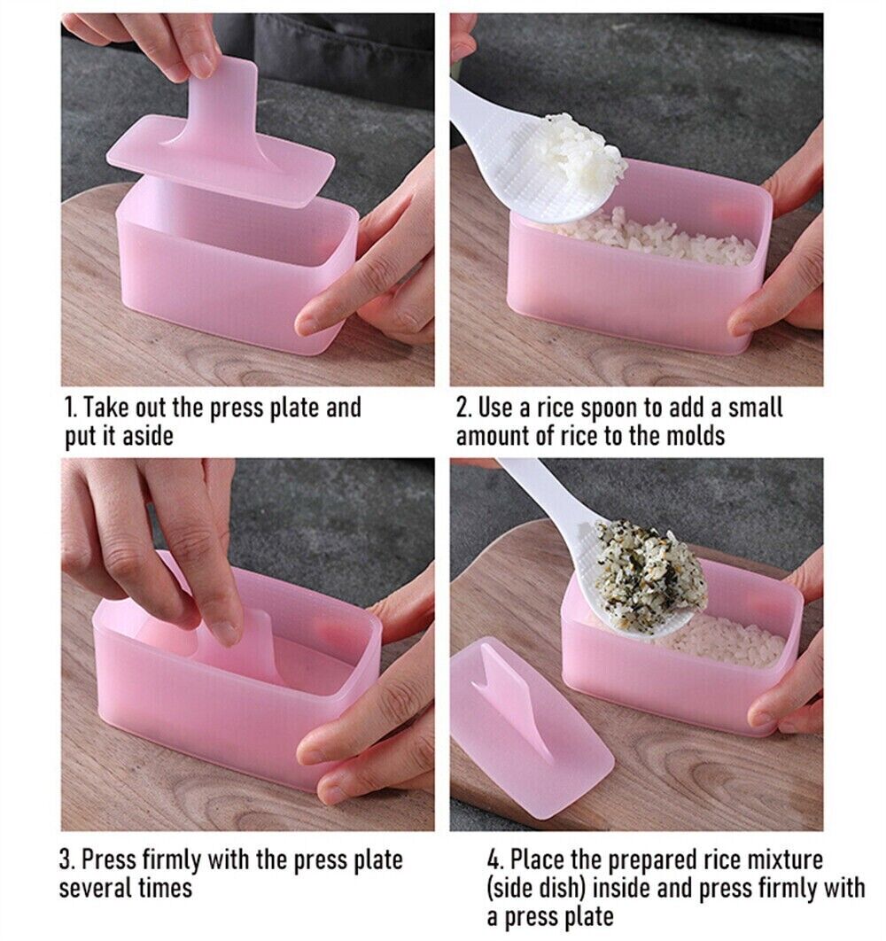 The sushi mold consists of a mold box, a press plate, and a rice spoon, which is used to add rice and ingredients to the mold and then pressed with a press plate.