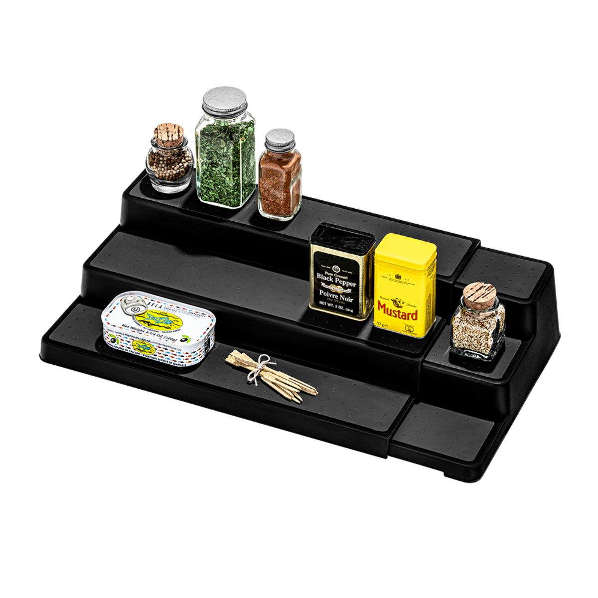 The shelving solution expands and contracts to better fit your space and is perfect for organising items like spices, cans, or jars, with the 3-tier design making viewing easy.