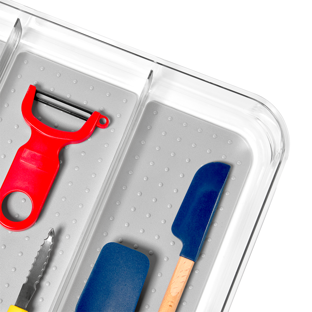The soft-grip lining keeps utensils in place and organised, while the rounded corners allow for easy cleaning.