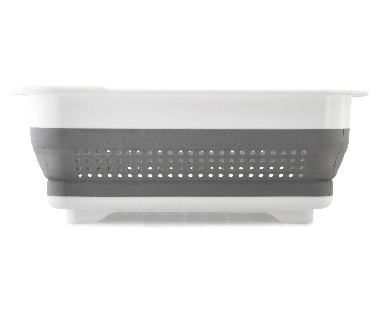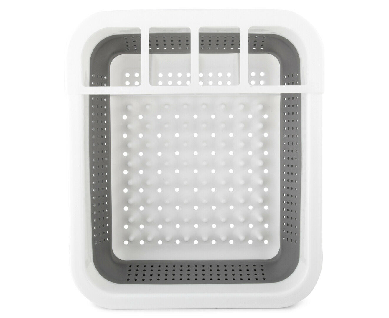 The madesmart Collapsible Dish Rack stores and organizes dishes and glassware as they dry after washing with a separate compartment for silverware, gadgets, and kitchen tools. Flexible material allows the dish rack to collapse flat for space-saving storage, making the most of your kitchen countertop or sink. Can be used with a drying mat or drain board.