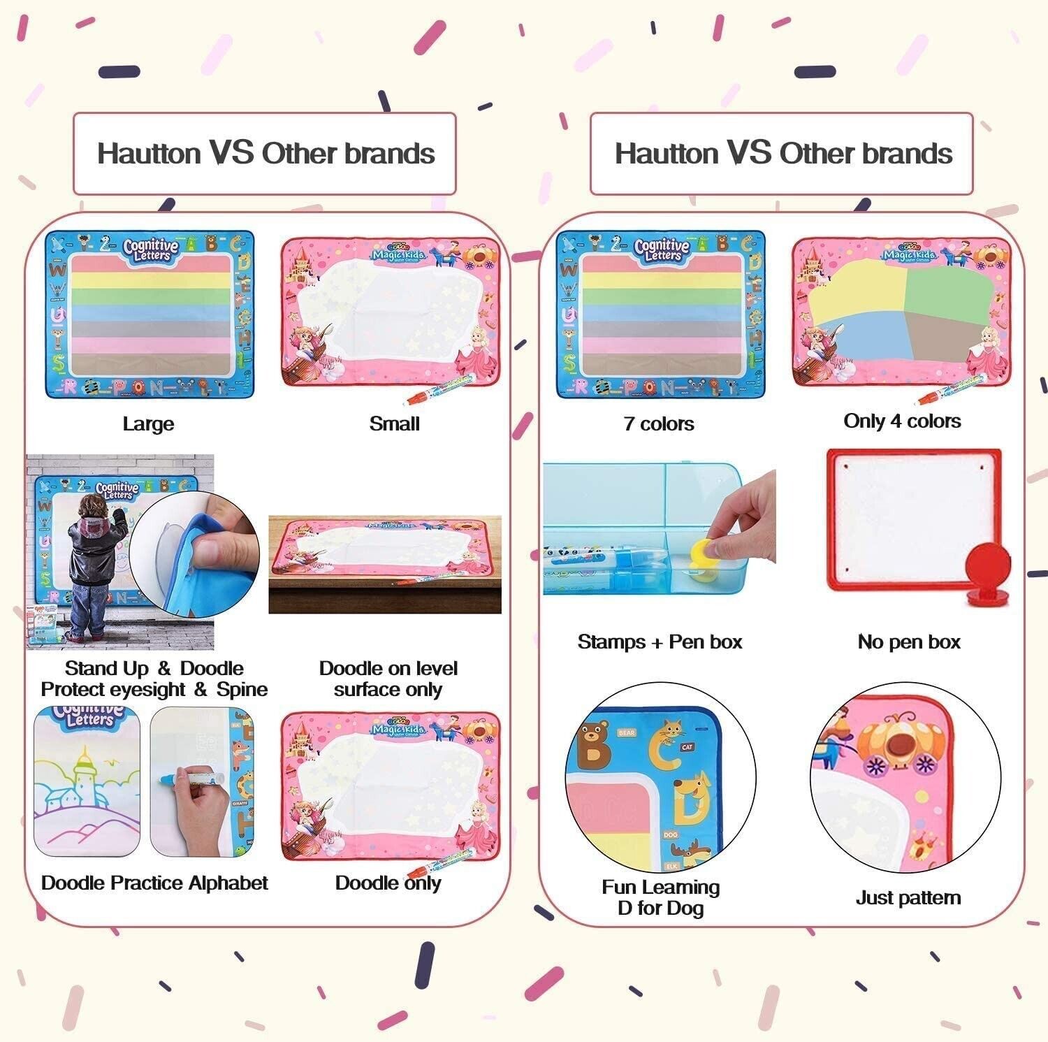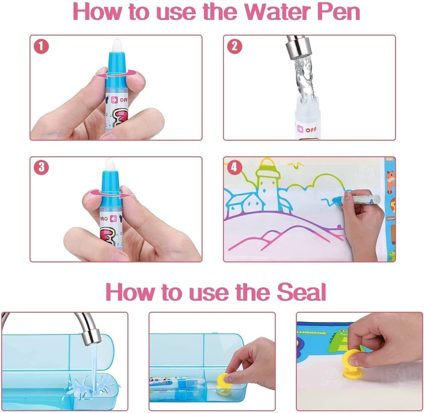 - Easy Use Reusable - Just fill the magic pen with clean water, and draw on the magic water doodle mat; After 3-10 minutes, the drawing will magically disappear (depending on temperature and airflow), and your kids can create other works again and again (Tips: Please immerse the pen into the water for 1 hour before the first use).