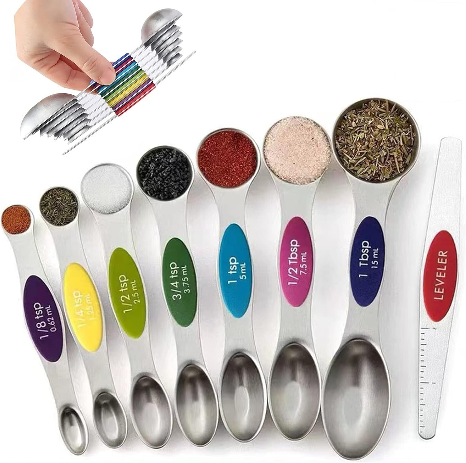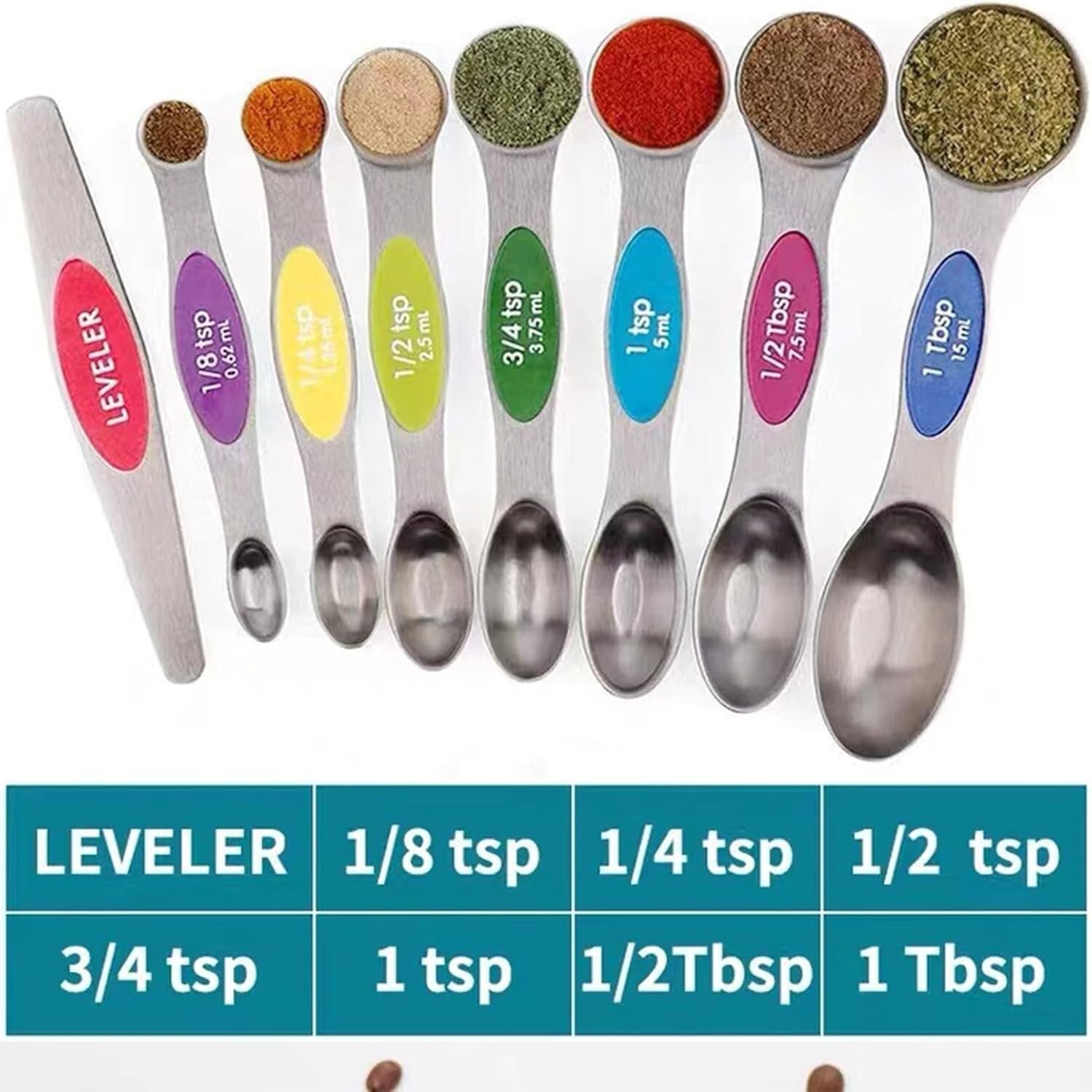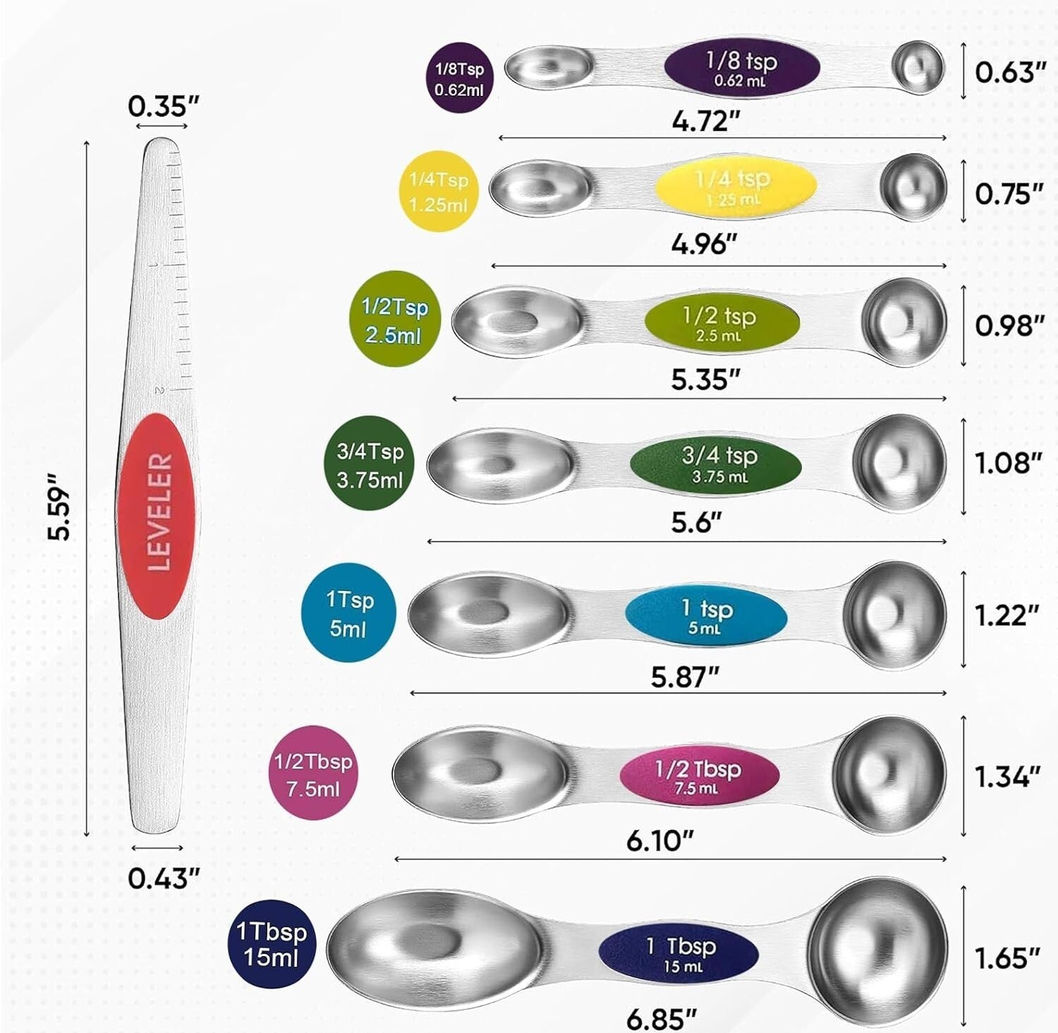 Stainless Steel Measuring Spoons Set of 8, including 7 Double Sided Magnetic Measuring Spoons ( 1/8 tsp, 1/4 tsp, 1/2 tsp,3/4 tsp, 1 tsp, 1/2 tbsp, 1 tbsp) and 1 Leveler, meet all your needs on cooking and baking,It is a gift for every chef