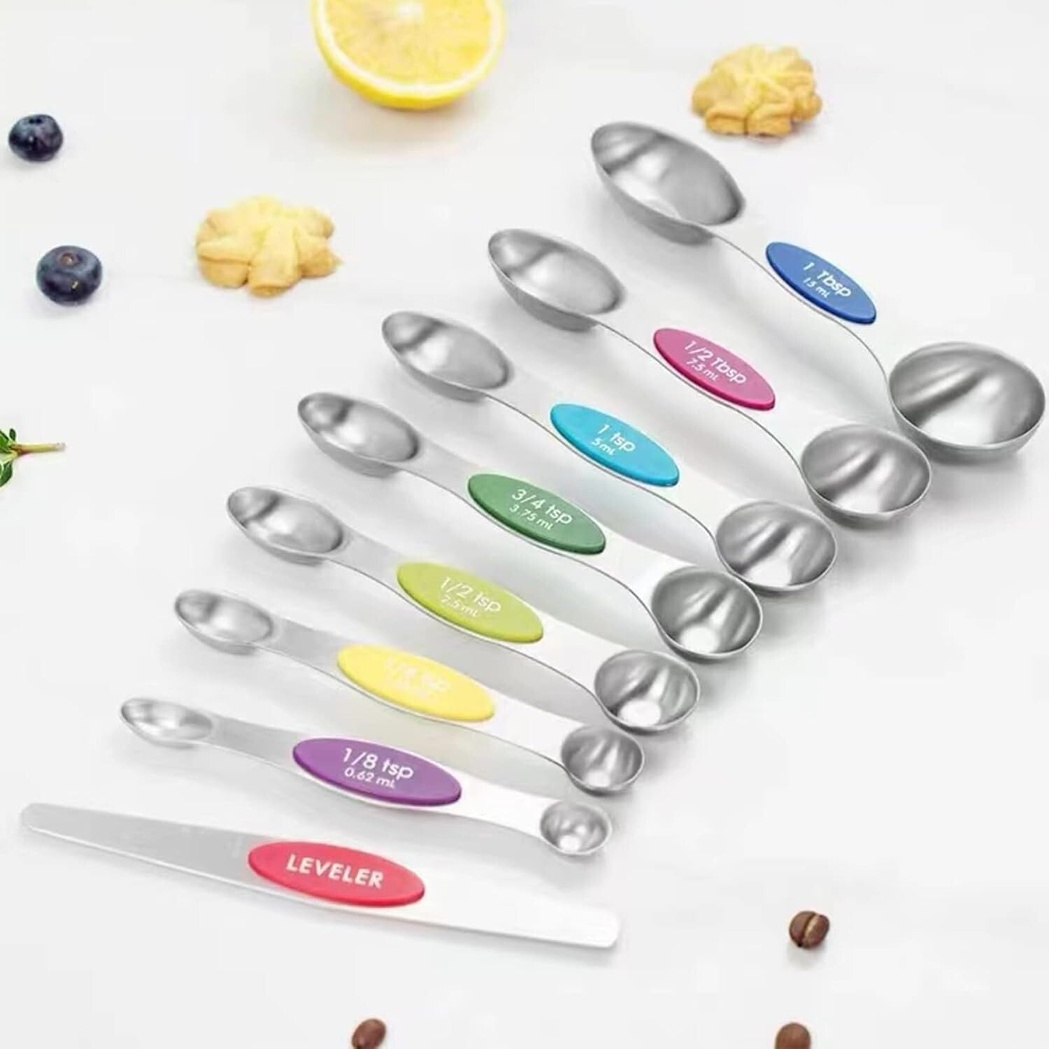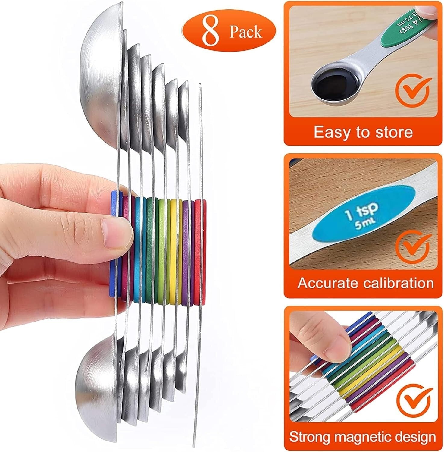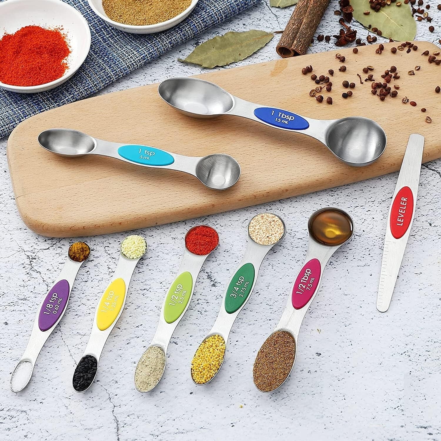 Stainless Steel Measuring Spoons Set of 8, including 7 Double Sided Magnetic Measuring Spoons ( 1/8 tsp, 1/4 tsp, 1/2 tsp,3/4 tsp, 1 tsp, 1/2 tbsp, 1 tbsp) and 1 Leveler, meet all your needs on cooking and baking,It is a gift for every chef