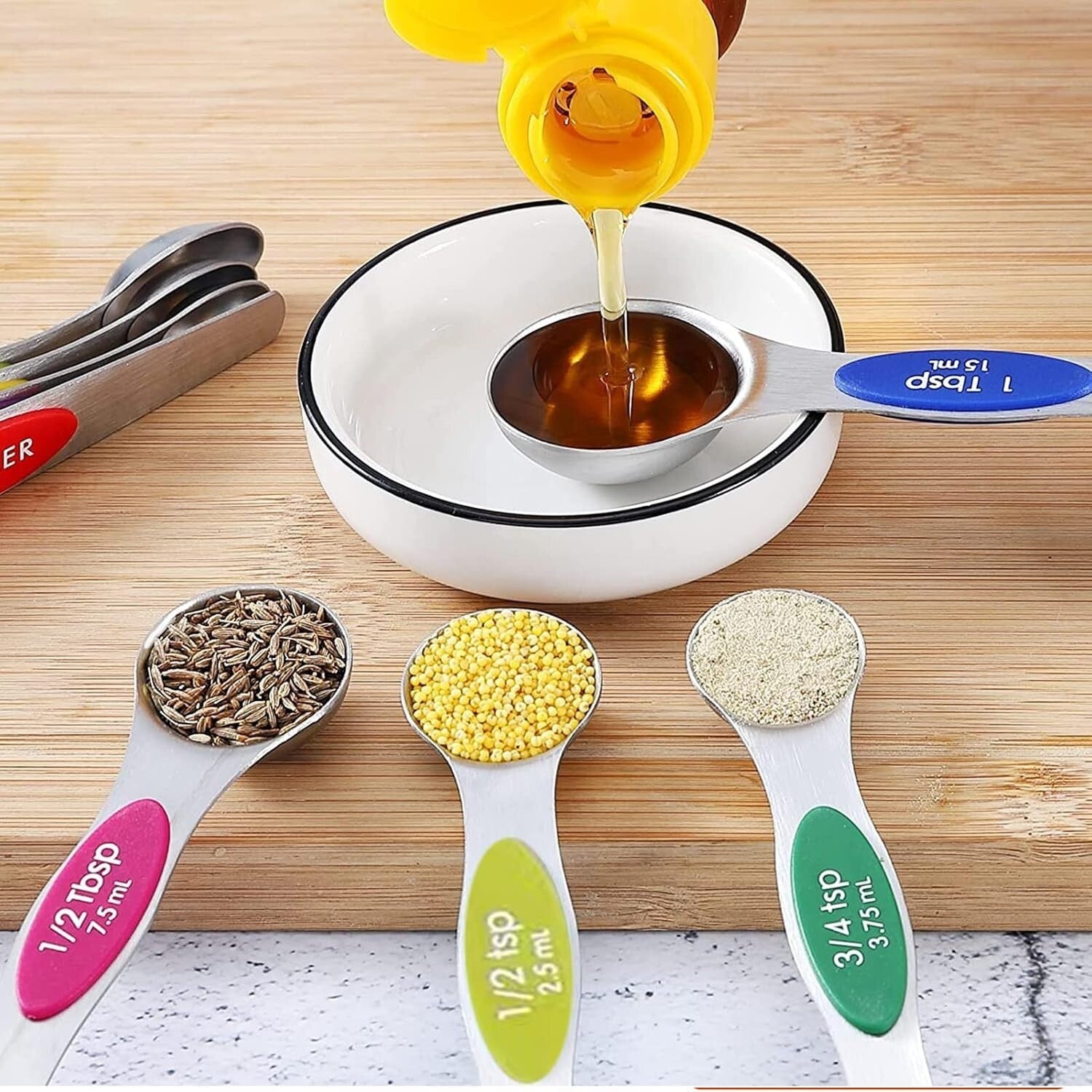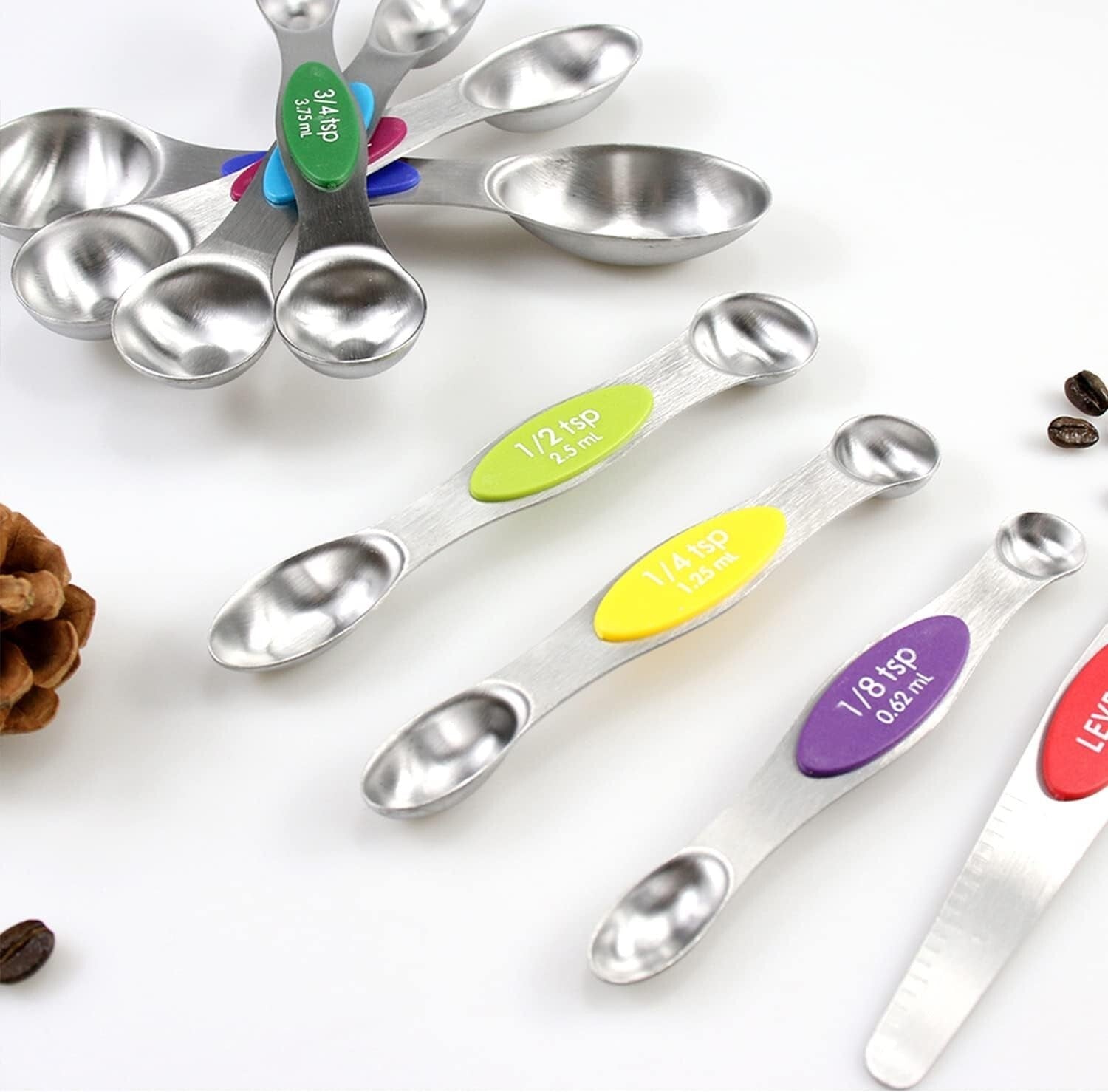 These magnetic narrow stainless measuring spoons are great for measuring coffee, protein powder, spices, baking powder and more, Color-coded labels allow you to quickly find them while cooking