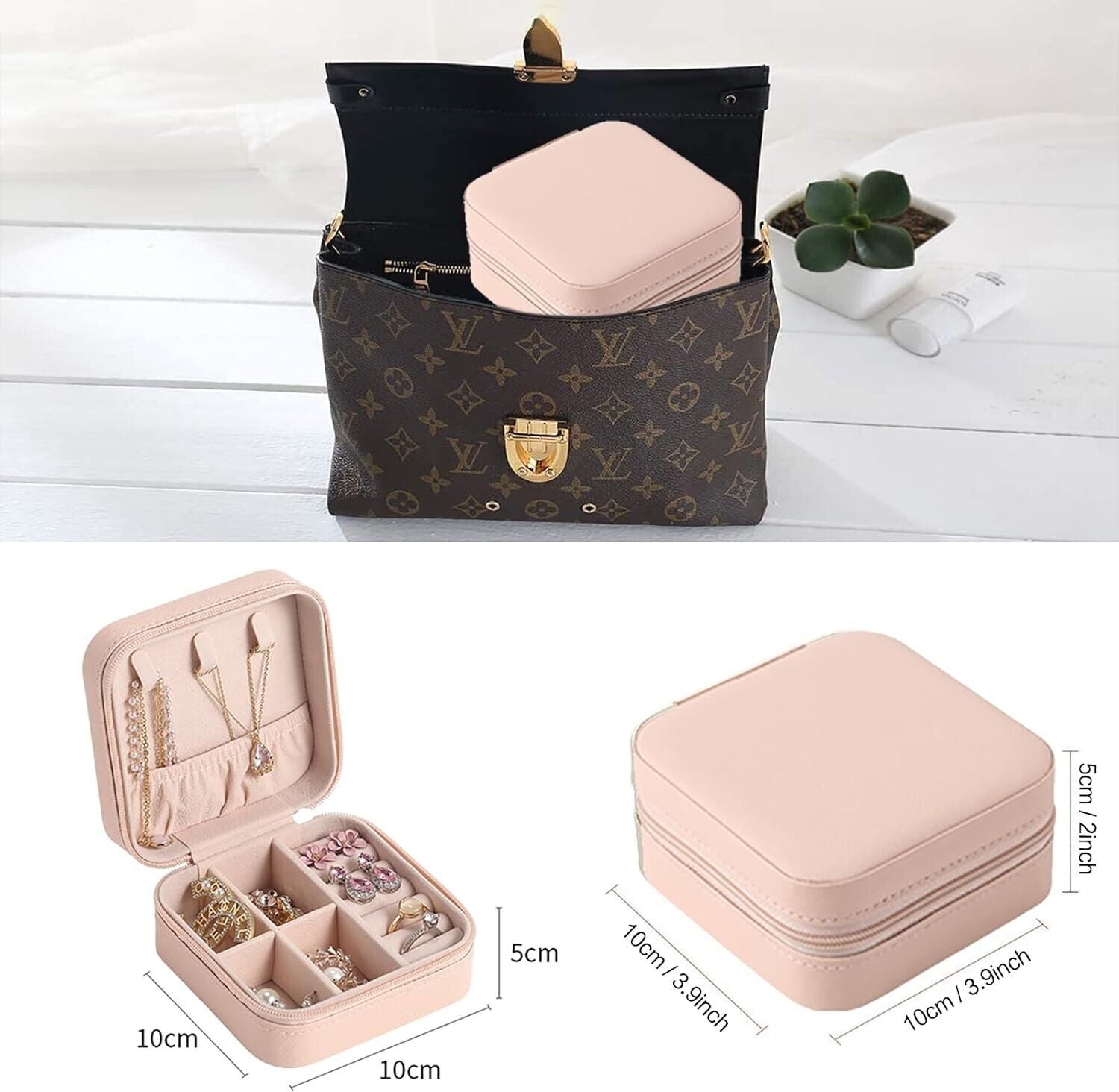 DIMENSION: 10 x 10 x 5 cm. As a multi-functional jewelry case, it suits for necklaces, watches, earrings, ear studs, hairpins, cufflinks, brooches and other jewelry. Note: Due to manual measurement, please allow the size to have an error of 1-2 cm.