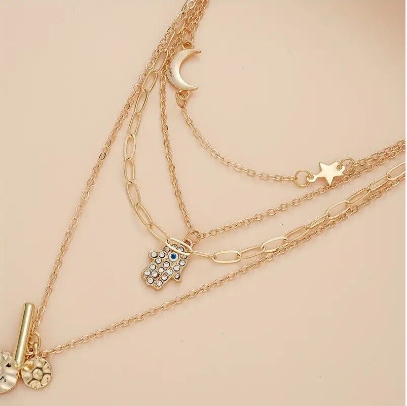 Layered Pendant Necklace for Women - Vacation and Daily Wear, Multi-Strand Golden Tone Charms with Rhinestones, Eye, Star, Moon, and Disc Pendants, Zinc Alloy, No Plating - Versatile Jewelry Gift
