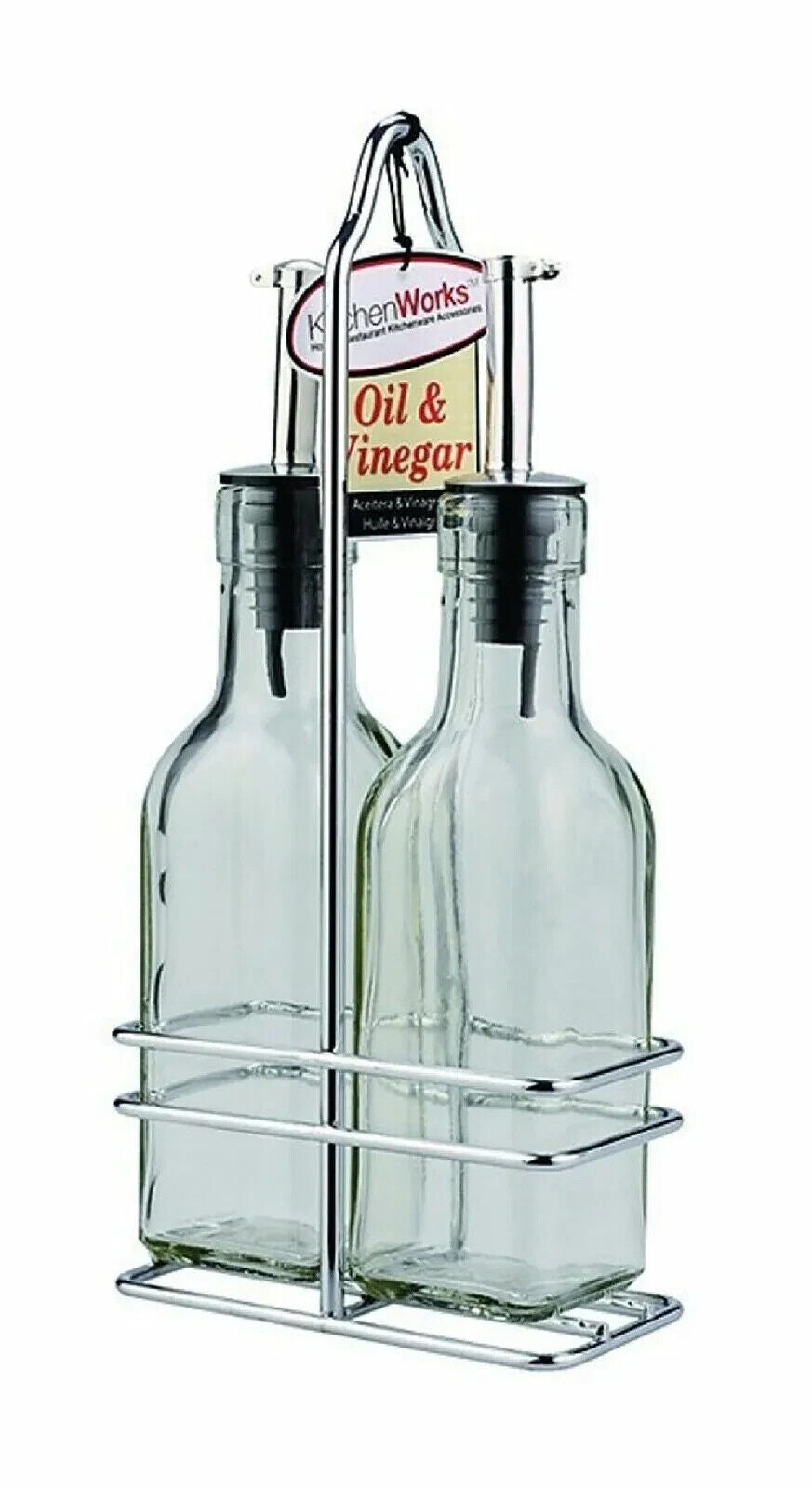 The Kitchen Works Oil and Vinegar Bottle Set with Stand features glass bottles and a rack stand, helping keep your condiments organised.