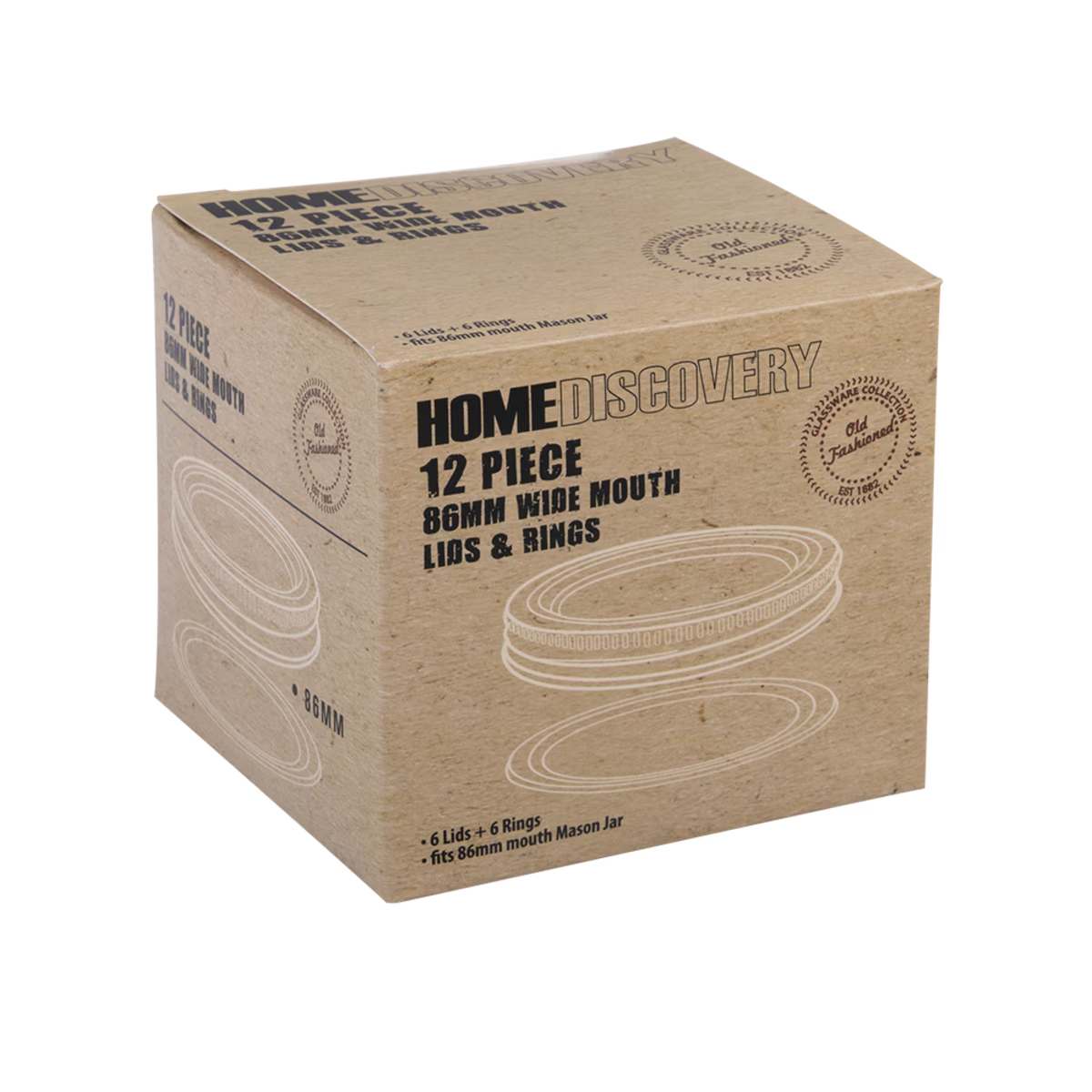 This 12 piece set of 6 lids and rings fit an 86mm wide mouth Mason Jar.