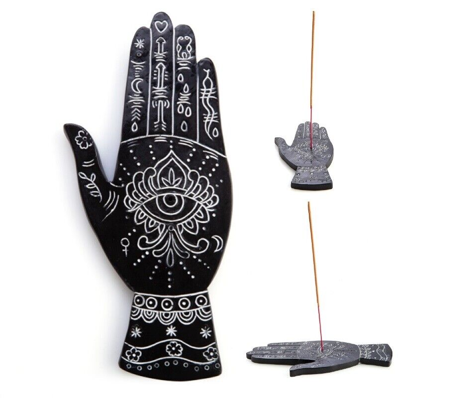 - Black hand-shaped incense burner featuring white carved palmistry details.