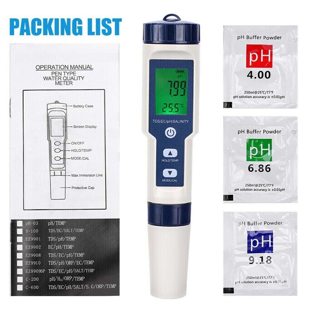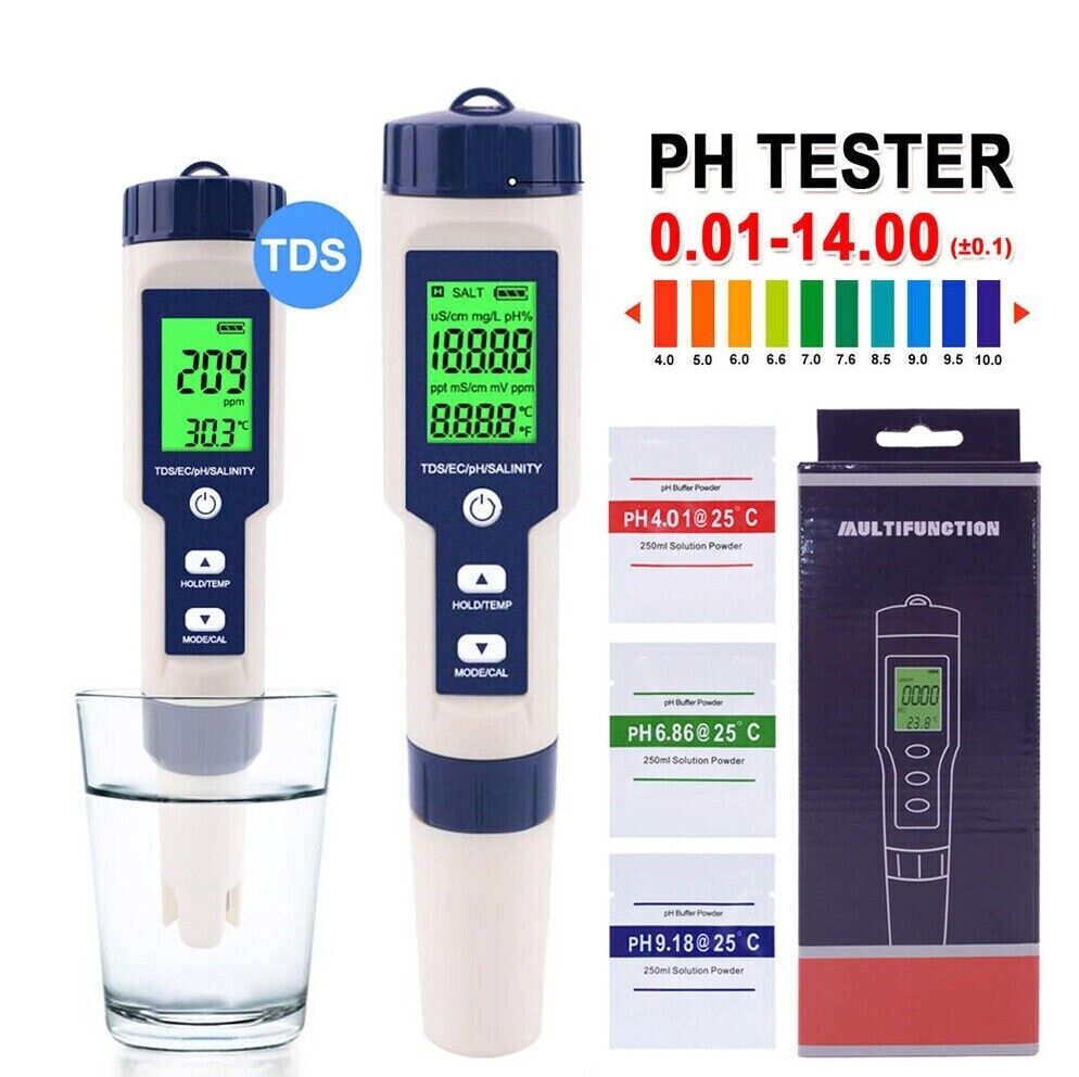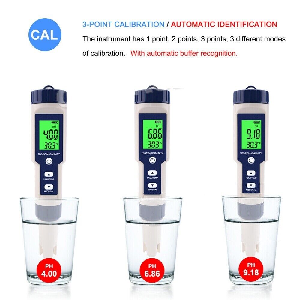 5 in 1 Multi-Function Water Quality Tester which can measure pH, TDS, EC, Salinity and Temperature in Solution.