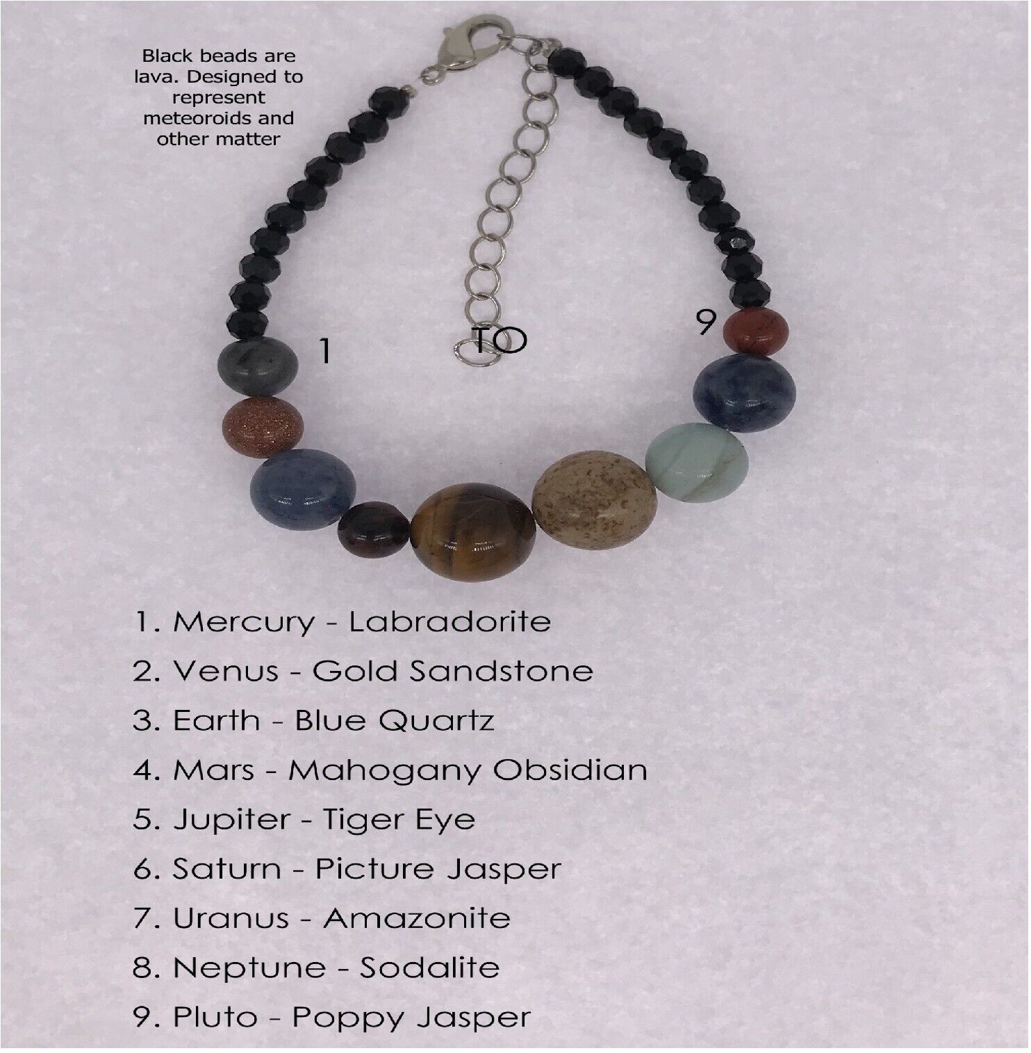 The planets can be seen as: Saturn (Yellow Calcite), Uranus (Amazonite), Neptune (Blue Cat's Eye), Pluto (Poppy Jasper), Mercury (Labradorite), Venus (White Quartz), Earth (Sodalite), Mars (Mahogany Obsidian), and Uranus (Amazonite).