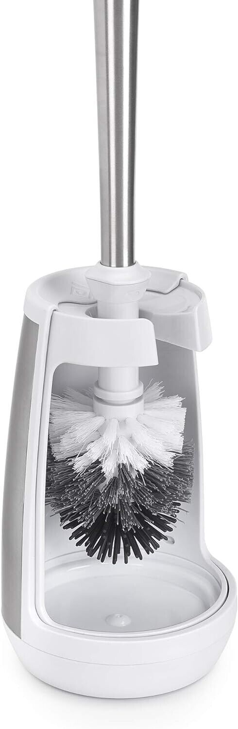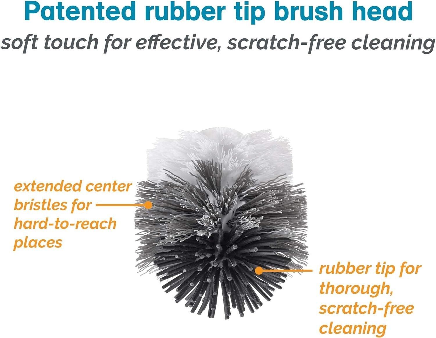 Our latest design in toilet brushes, the Swivel features a rotating handle that secures in place, rotates, and closes the caddy base to help conceal the brush head for a sleek look while stored. Keeps brush head hidden and handle upright. Brush head with centre row of upward facing bristles for hard-to reach places. Twist-to-remove brush head is replaceable. Open back design helps water evaporate for odor control.
