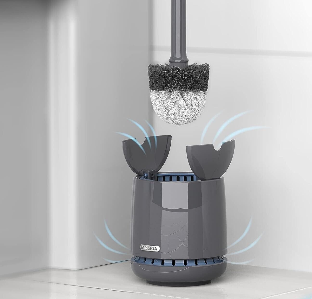 Lid opens automatically when toilet brush is lifted, and bottom ventilation allows for quick evaporation; Lid closes simultaneously when you place toilet brush back into holder, and the upper ventilation starts working which provides hygienic air dry. Compact space saving design keeps your toilet brush hidden and offers a sanitary storage.