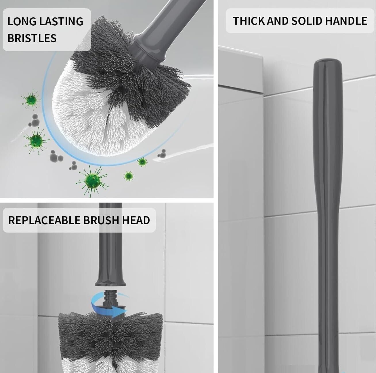 Strong bristles are not easy to get deformed which remove stains easily, the dense bristles offer thorough and deep cleaning for under-rim area and those hard-to-reach corners. Water easily drips off bristles into bottom of holder, brings you a refreshing cleaning experience. For replacement brush head, please refer to ASIN B08YRRDKDQ.