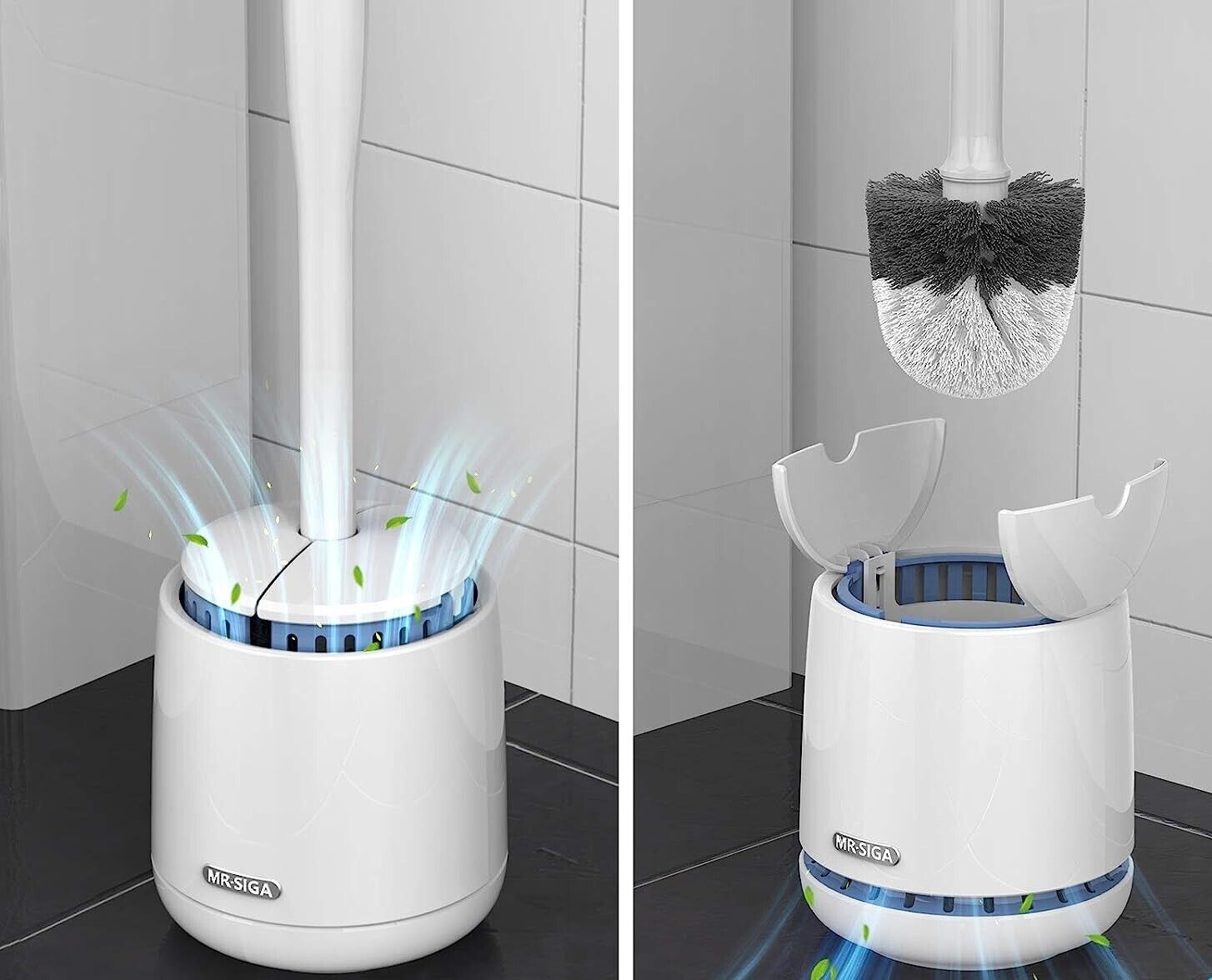 Lid opens automatically when toilet brush is lifted, and bottom ventilation allows for quick evaporation; Lid closes simultaneously when you place toilet brush back into holder, and the upper ventilation starts working which provides hygienic air dry. Compact space saving design keeps your toilet brush hidden and offers a sanitary storage.