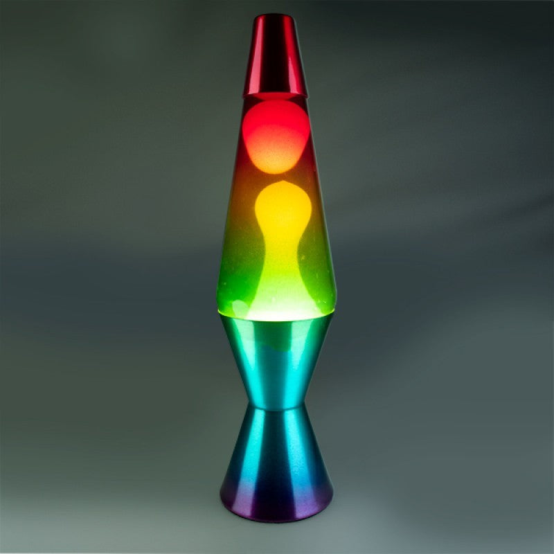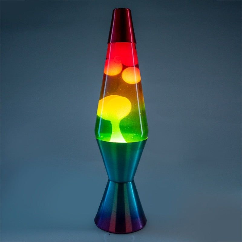 - Features a rainbow gradient glass body with lava that swirls and ripples when lit