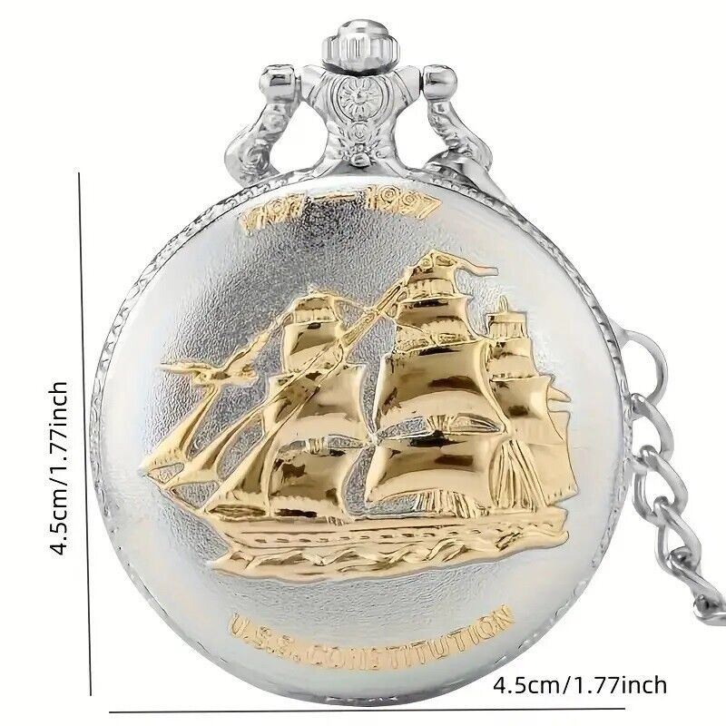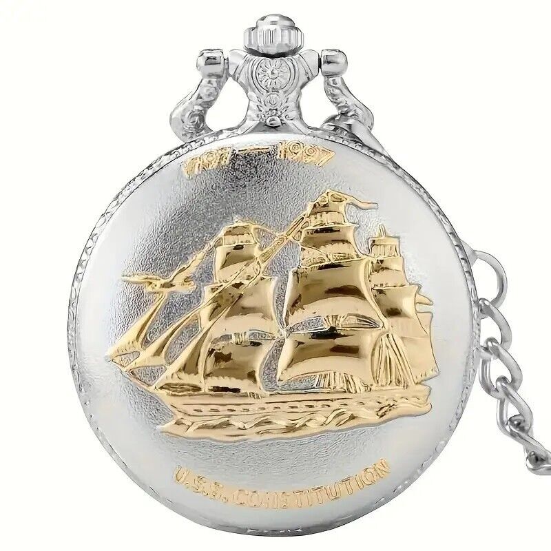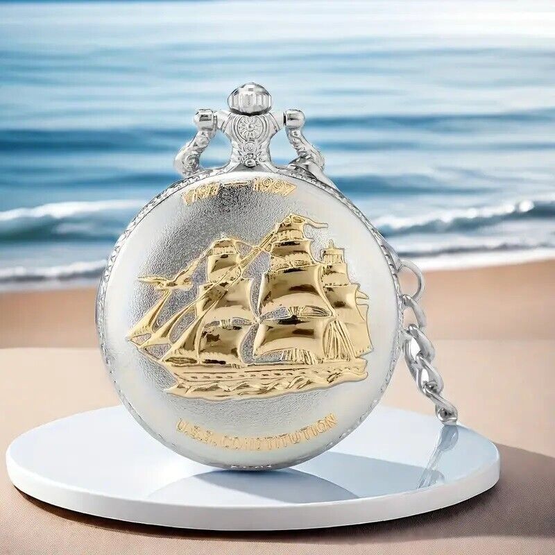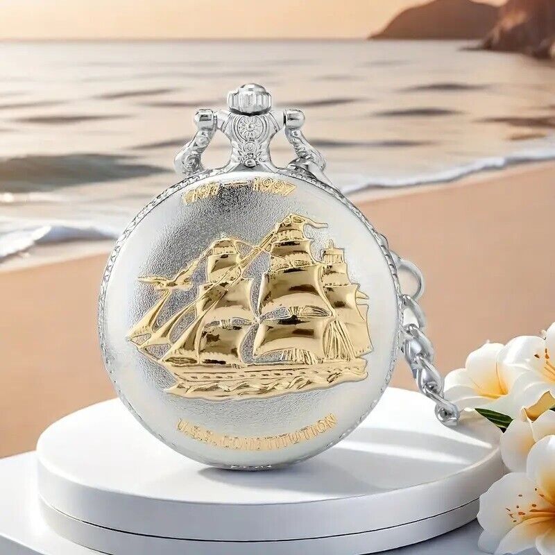 Vintage Silvery Sailboat Quartz Pocket Watch Necklace Pendant Men's Pocket Watch