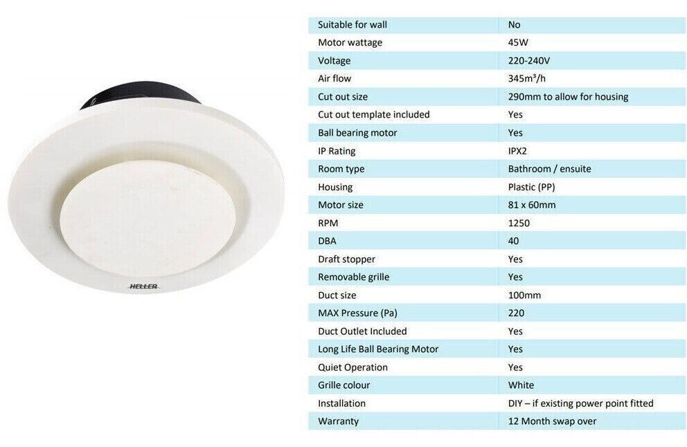Round Ducted Exhaust Heller White Ceiling Fan Laundry Bathroom - 250mm