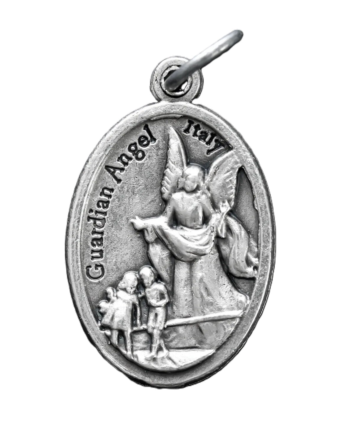 Guardian angel oval religious medal. The front of the medal depicts a guardian angel with children and "Pray For Us" is engraved on the back. This detailed die-cast medal is made in the region of Italy that produces the finest quality medals in the world.