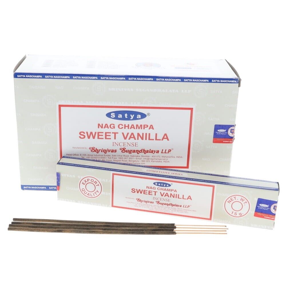 Package Includes: Box with 12 Packets of Incense Sticks 15g Satya Mumbai Sweet Vanilla