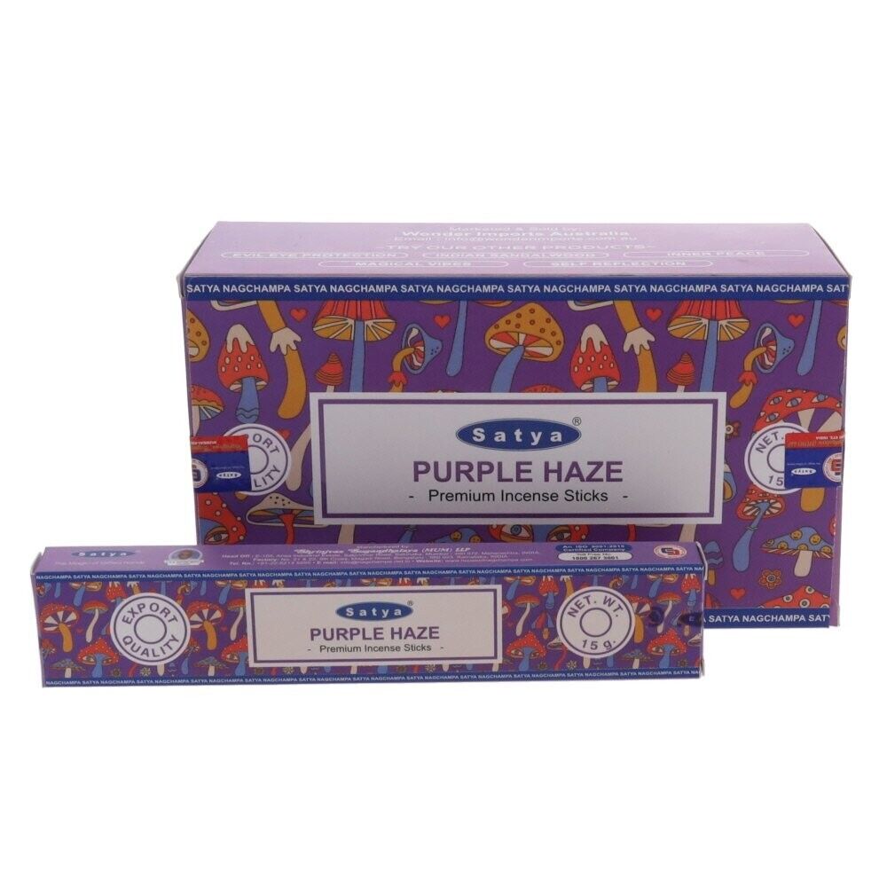 Package Includes: Box with 12 Packets of Incense Sticks 15g Satya Purple Haze