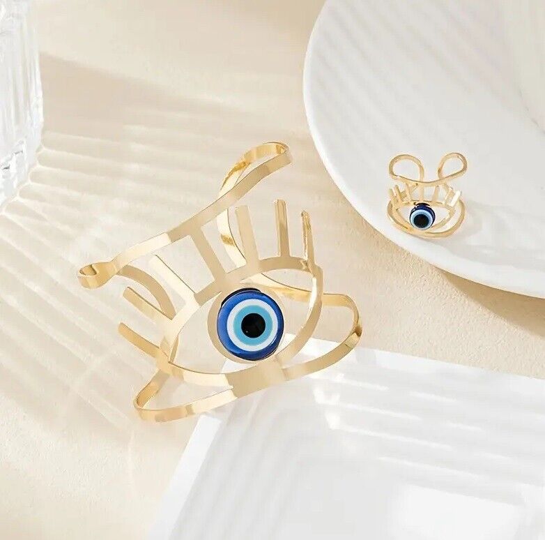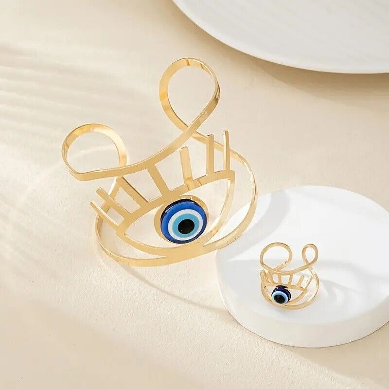 Set Evil Eye Ring & Bracelet Adjustable Golden Fashionable Style Jewelry Large