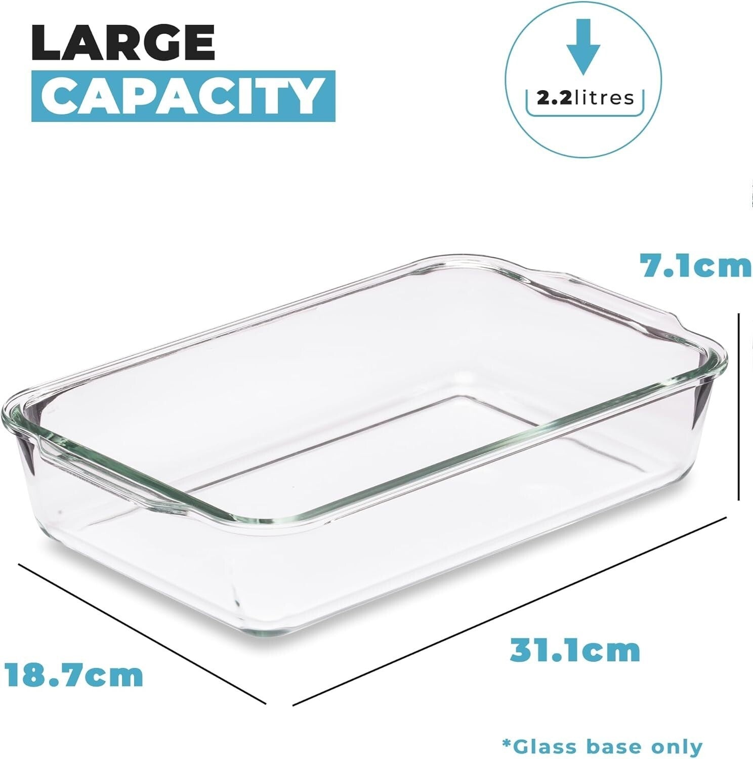 Modernise your bakeware with this large glass roasting dish; Snap locking lid and silicone ring creates a strong airtight seal for leak-free storage ensuring your food stays fresh and free from outside bacteria; Each glass tray measures 30.8 cm (l) x 18.4 cm (w) 6.2 cm (h) (Glass base only) and can hold 2.2 litres of hot or cold food