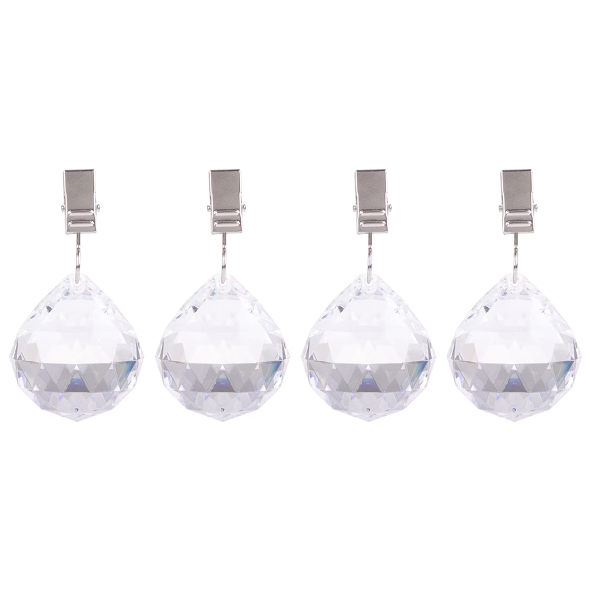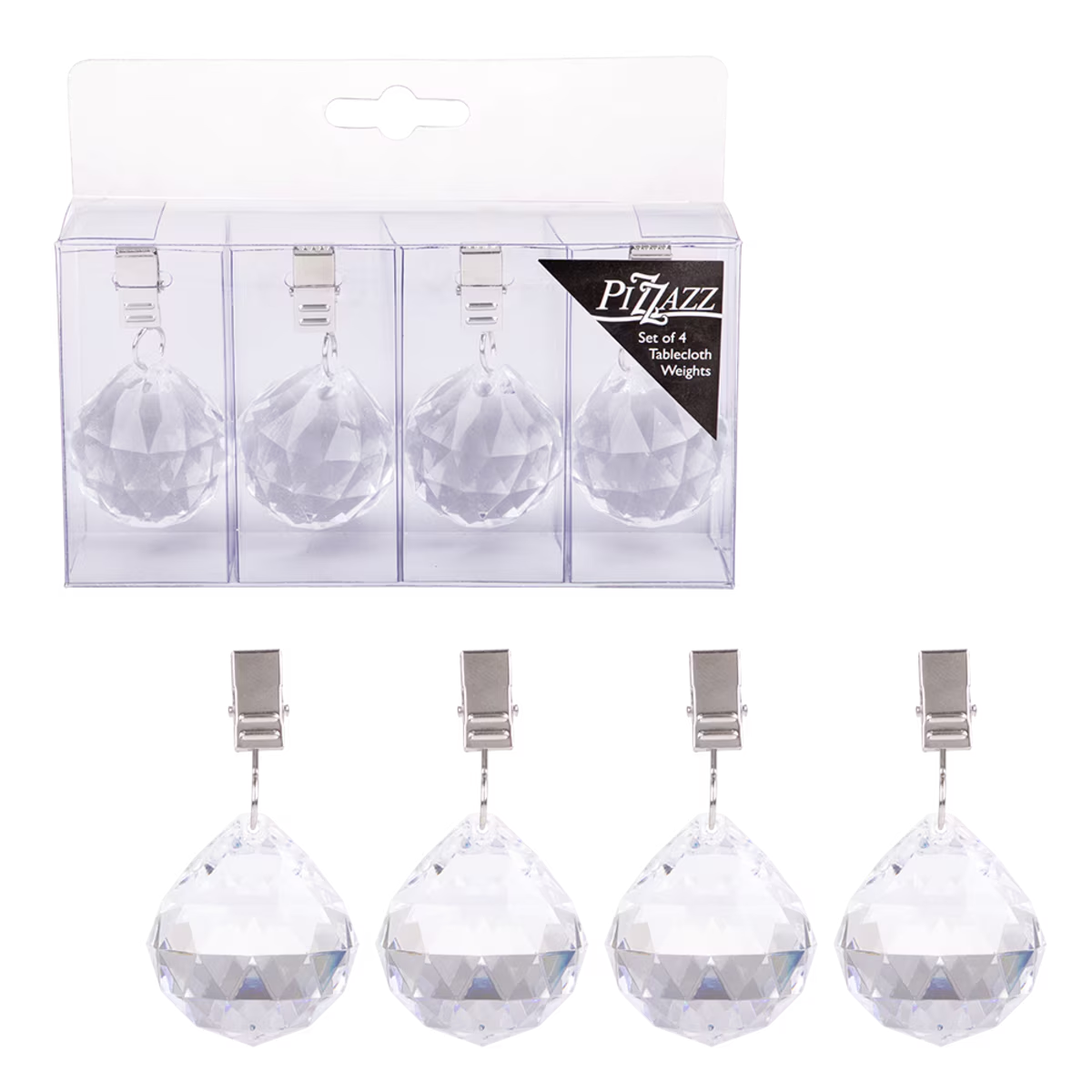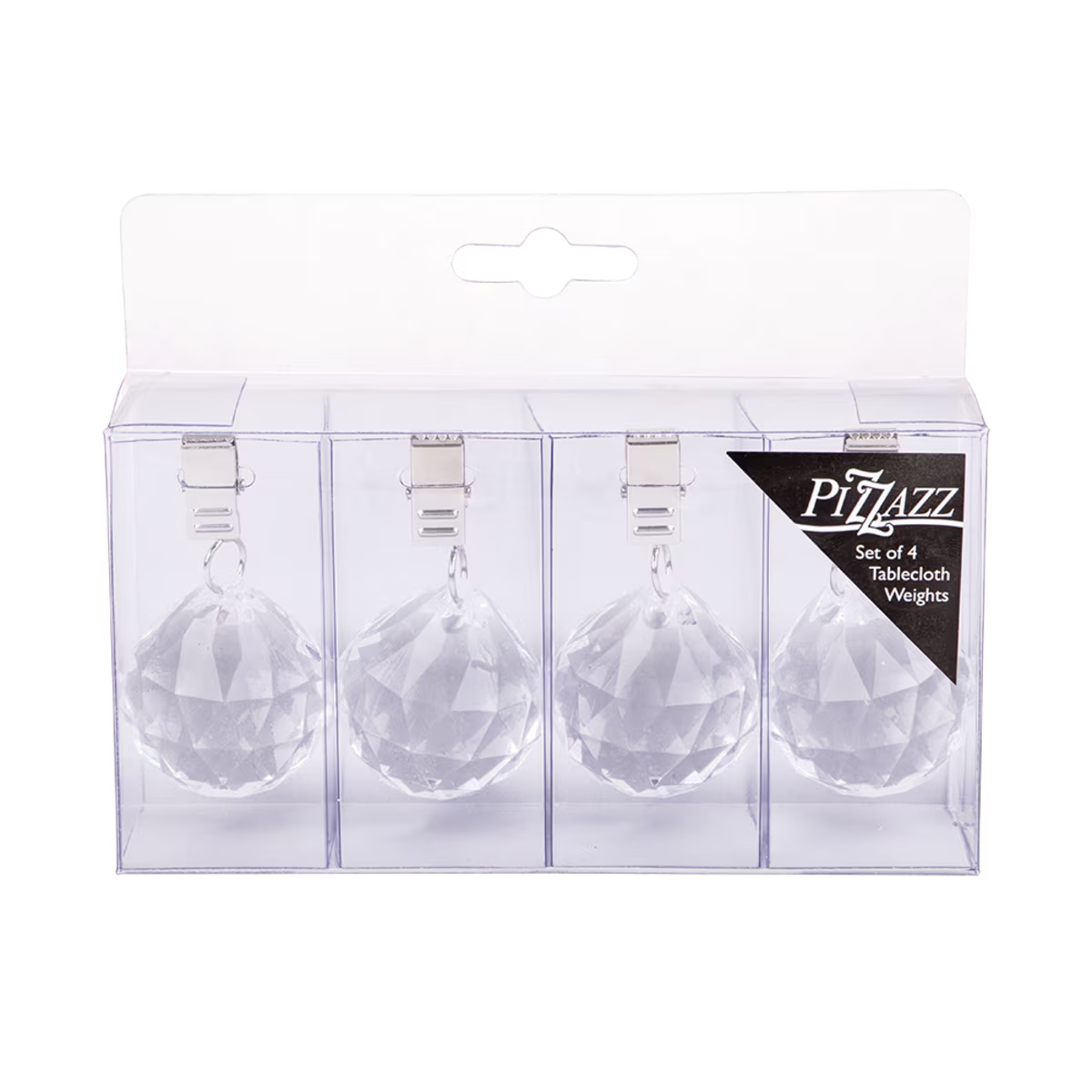 Package Includes: Set of 4x Pizzazz Acrylic Crystal Tablecloth Weights.
