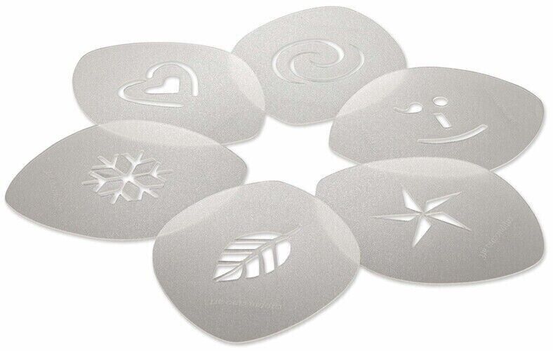 The set includes 6 different designs (swirl/whisk, smile/wink, star/space, leaf/autumn, snowflake/festive and heart/love) perfect to give an artistic and dazzling effect to your cappuccino, caffè latte and hot chocolate.